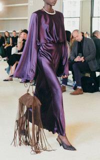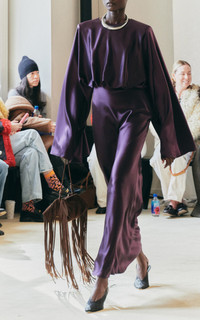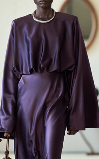 PRODUCT DETAILS - Long sleeve, draped blouson top, bias skirt, maxi hem - Concealed zip fastening - Composition: 100% Silk - Color: purple - Dry Clean Only - Fall/Winter '25
