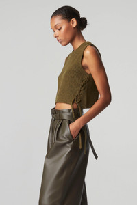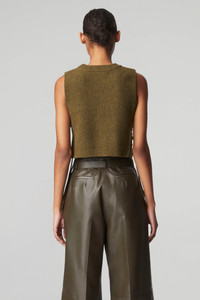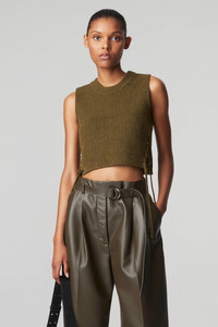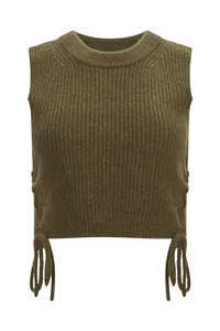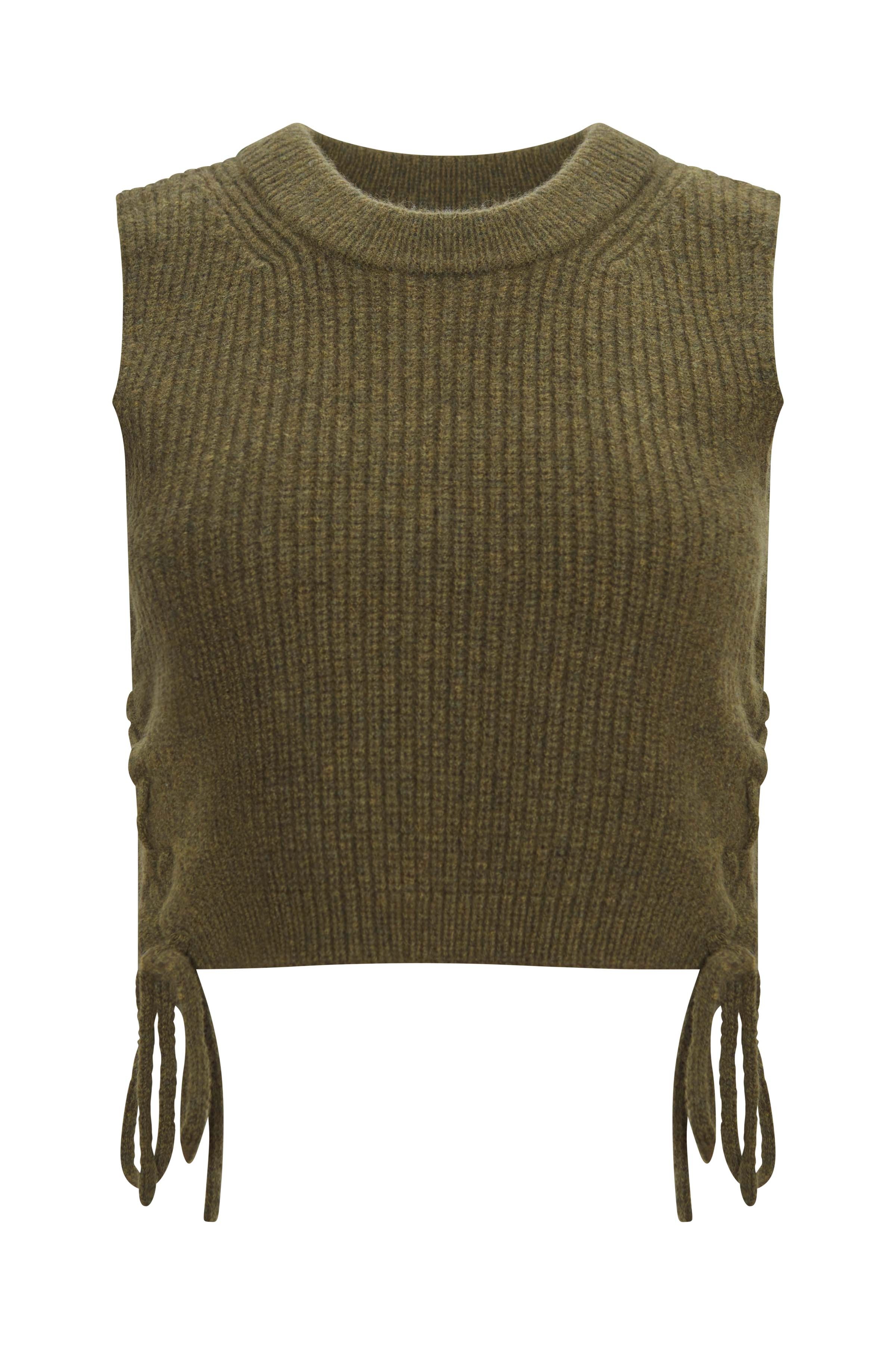 The ‘Amani’ sweater is spun from an ultrafine merino blend to a loose-fitting, sleeveless and slightly cropped silhouette. The rib-knit style is imagined in a sencha green color and features laced tie fastening sides. Details - Subtle cropped length - Side lace detailing - Ribbed-knit construction - 87% Ultrafine Merino 13% Polyamide - Model is 5' 10" and is wearing a size S