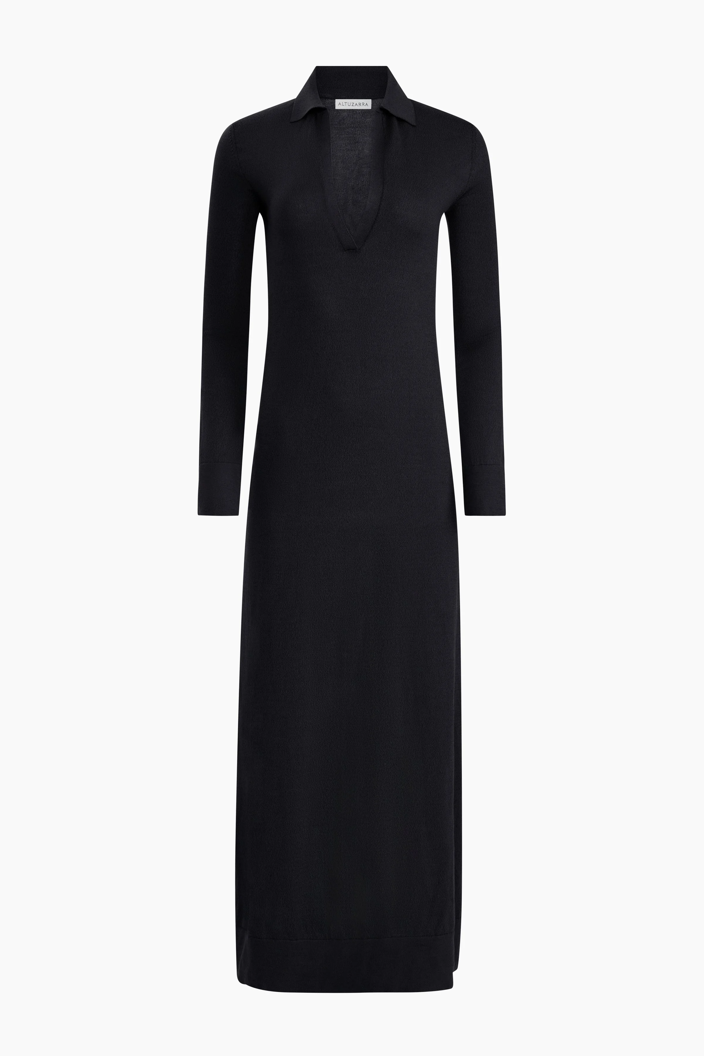 The Arp dress is a long-sleeve knit silhouette with a clean, minimal design. It features a pointed collar and a deep V neckline, balanced by a straight, ankle-length cut. Made in Italy from a blend of cotton and RWS-certified silk, it offers a smooth, lightweight feel. Details 68% Cotton 32% RWS Silk