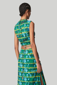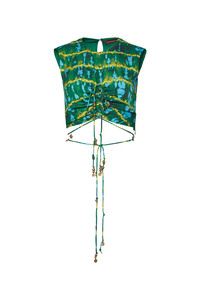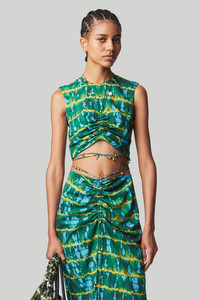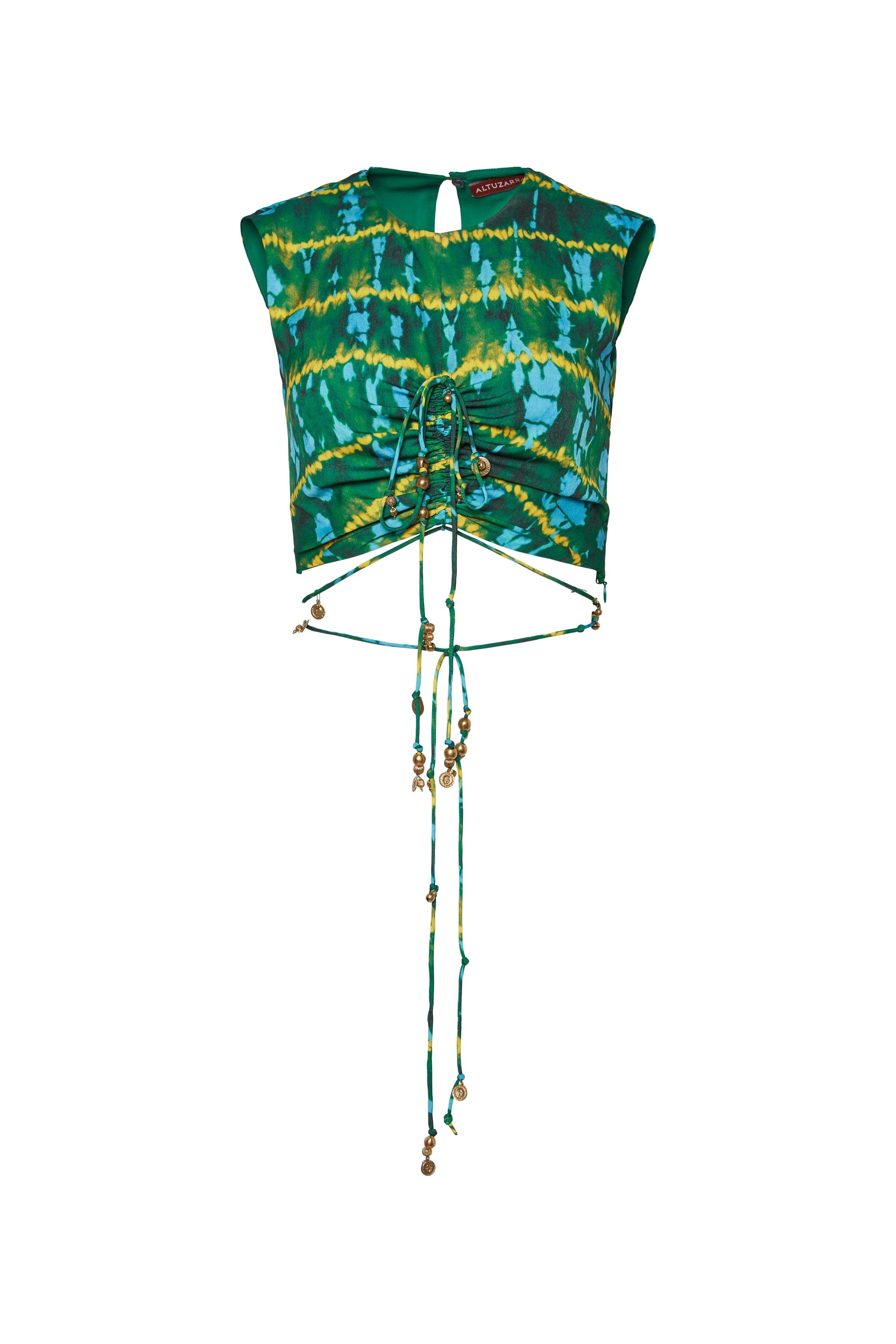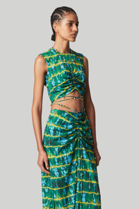 The ‘Ayana’ top showcases a cropped, asymmetric silhouette designed with a gathered bust. The multiple slim straps are embellished with gold-tone charms and fasten at the back of the neck and wrap around the waist. Details - Sleeveless - Cropped - Ruched detailing - 100% Polyester - Model is 5'10" and is wearing a size 36 - Top runs small, we recommend to size up 1 size