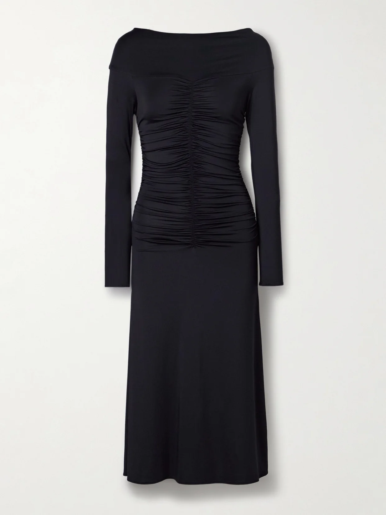 Altuzarra's 'Callie' dress is accentuated by ruching along the elongating center seam, creating texture through the figure-hugging fit. It's made from stretch-jersey and has a fold-over neckline that bares the shoulders. The floaty skirt moves elegantly as you walk.