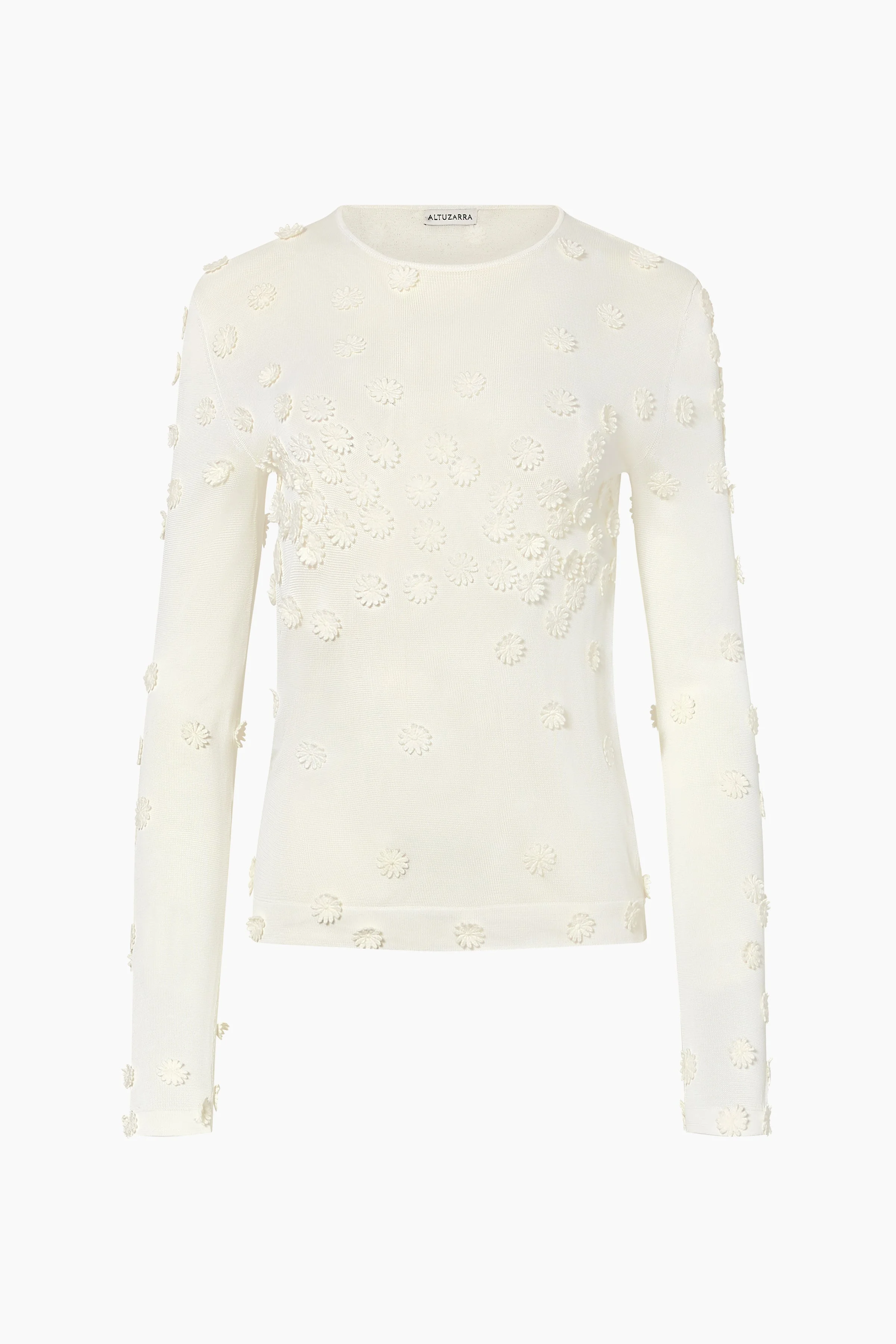 The Carter Top is designed with a fitted silhouette and a round neckline. It features long sleeves and is embellished with floral appliques across the design. Details 100% Dull Rayon