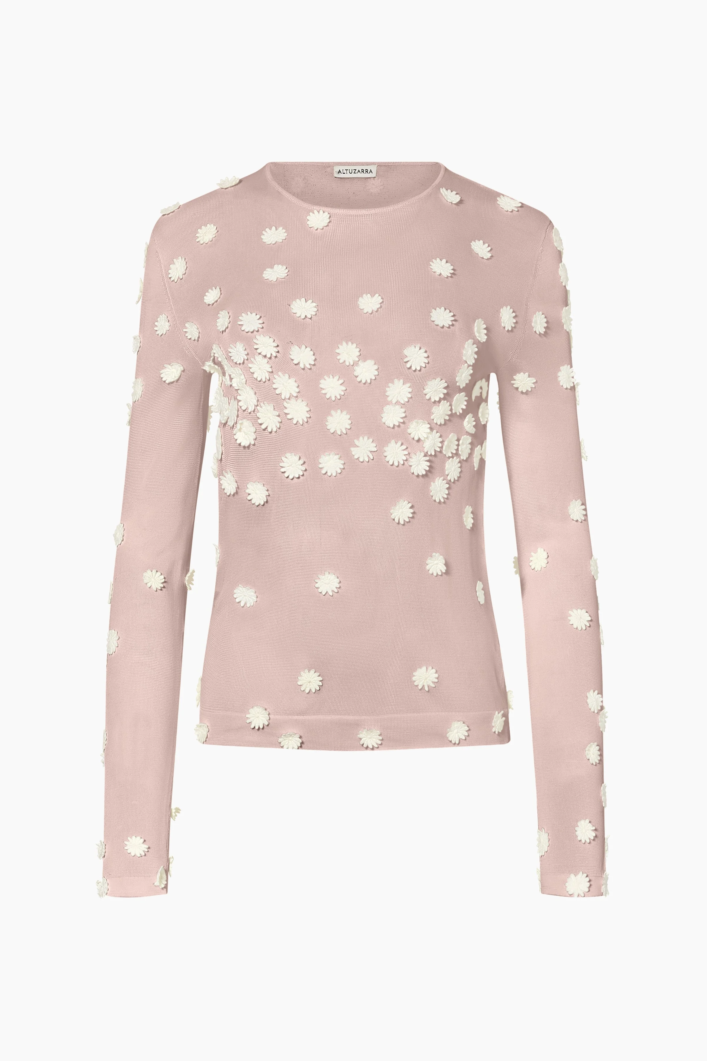 The Carter Top is designed with a fitted silhouette and a round neckline. It features long sleeves and is embellished with floral appliques across the design. Details 100% Dull Rayon