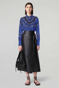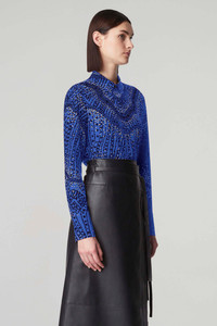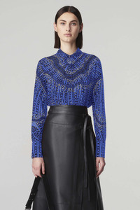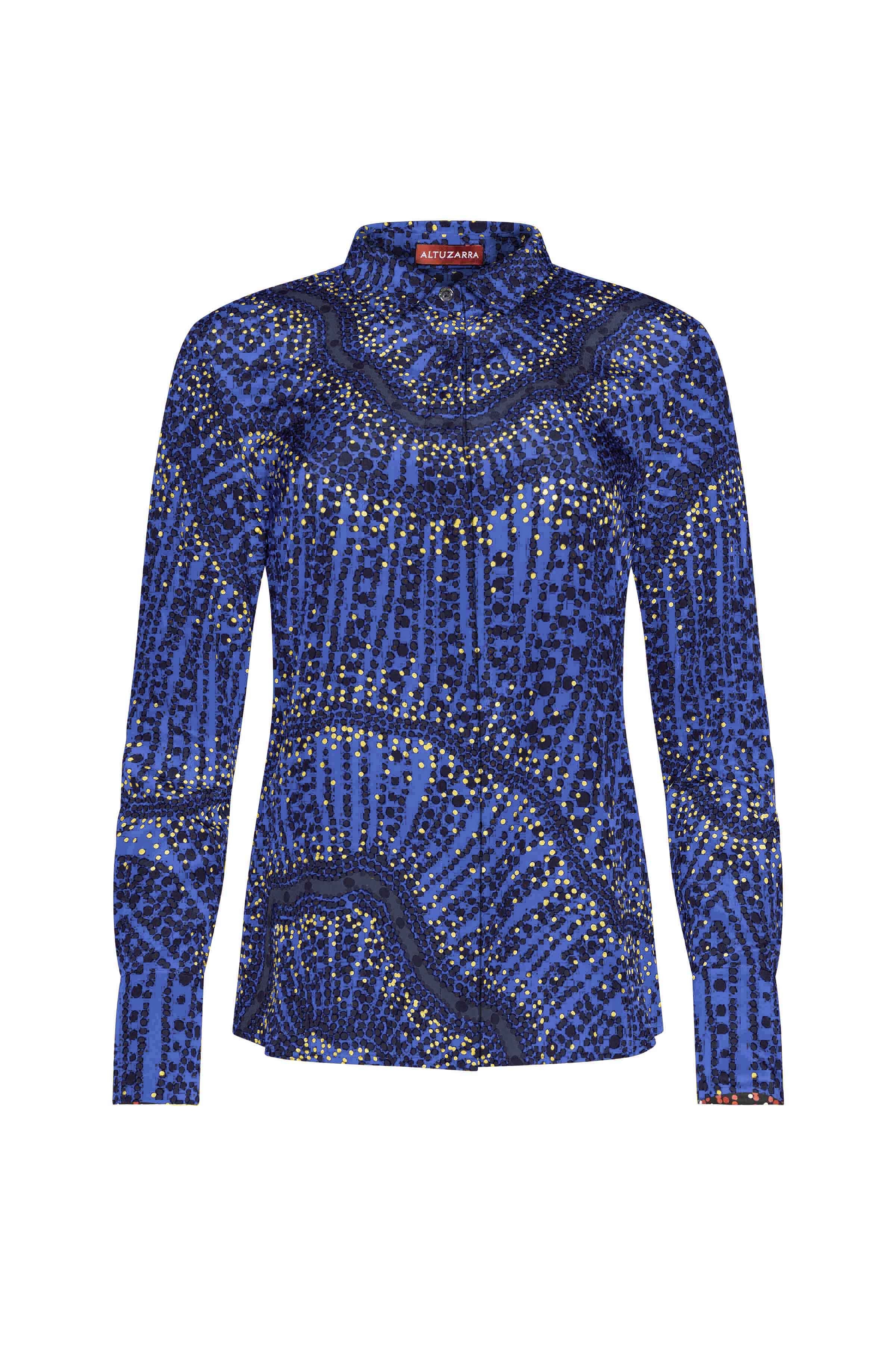 The 'Chika' Top is a signature style spun from pure silk and imagined in geometric stripes and multi dotted design. Capturing an easy elegance, the relaxed style features a small point collar, a concealed button front closure and long cuffed sleeves. Details - Point collar - Concealed center buttons - Long-sleeved with button cuffs - 100% Silk - Made in Italy - Model is 5'10" and is wearing a size 36