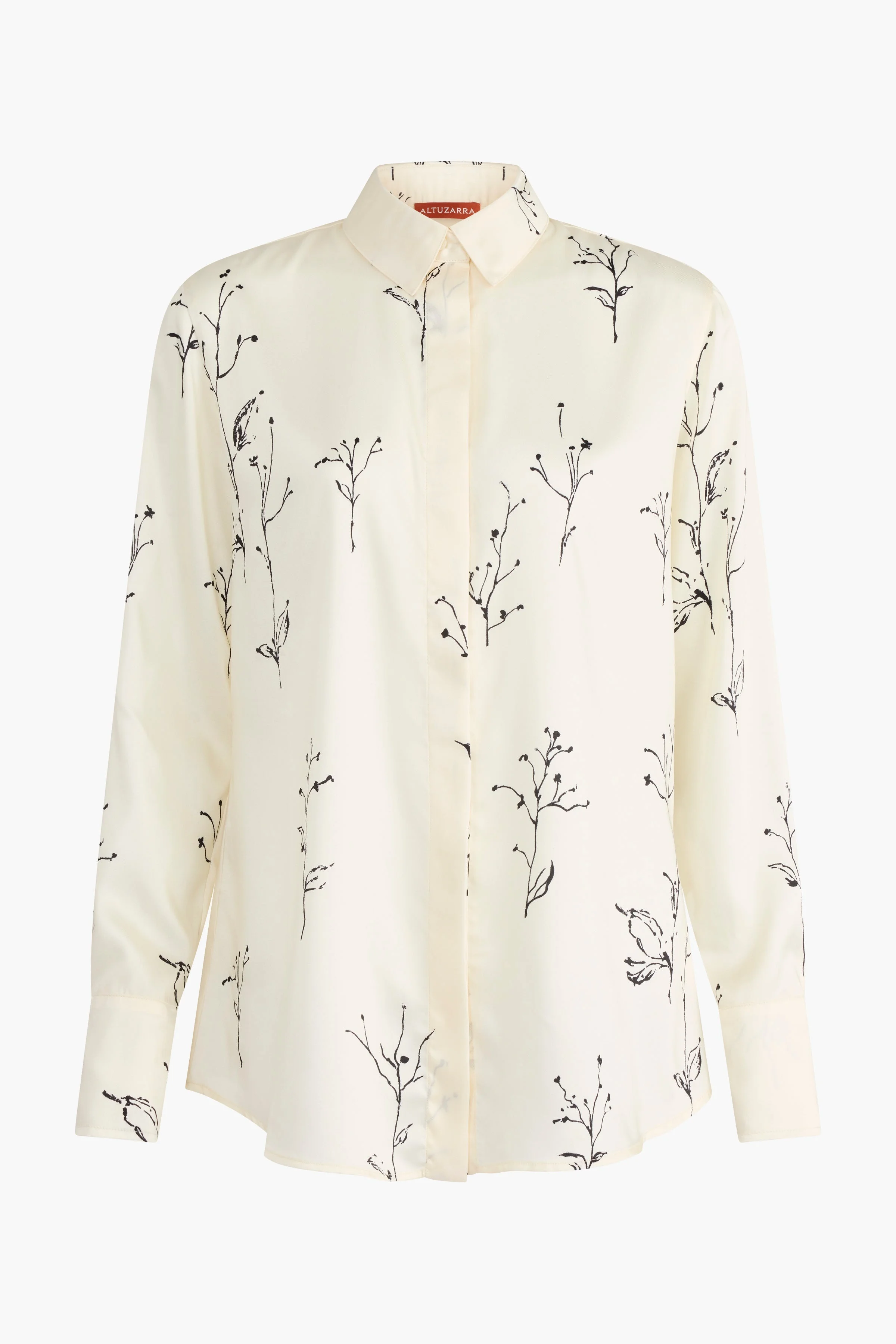 The Chika Top is a signature style in sheer chiffon. Capturing an easy elegance, the relaxed style features a small point collar and a concealed button front closure. Note the botanical print which evokes dried flowers, lovingly preserved or hastily sketched in a notebook Details 100% Polyester. Made in Portugal
