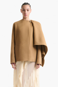 The Dak coat is a timeless outerwear option, shaped from a sumptuous virgin wool blend. First seen on the FW25 runway, worn with a sheer maxi skirt, it features a dramatic cape-style collar and two front pockets. Details 80% Virgin wool, 20% Polyamide. Made in Italy