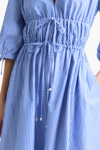 <!--br {mso-data-placement:same-cell;}--> The Donrine Dress in blue features self-tie drawstrings at the bust, waist and cuffs that create gathering through the body. Slip side pockets. Mid-length hem. Details 100% Cotton Made in Italy