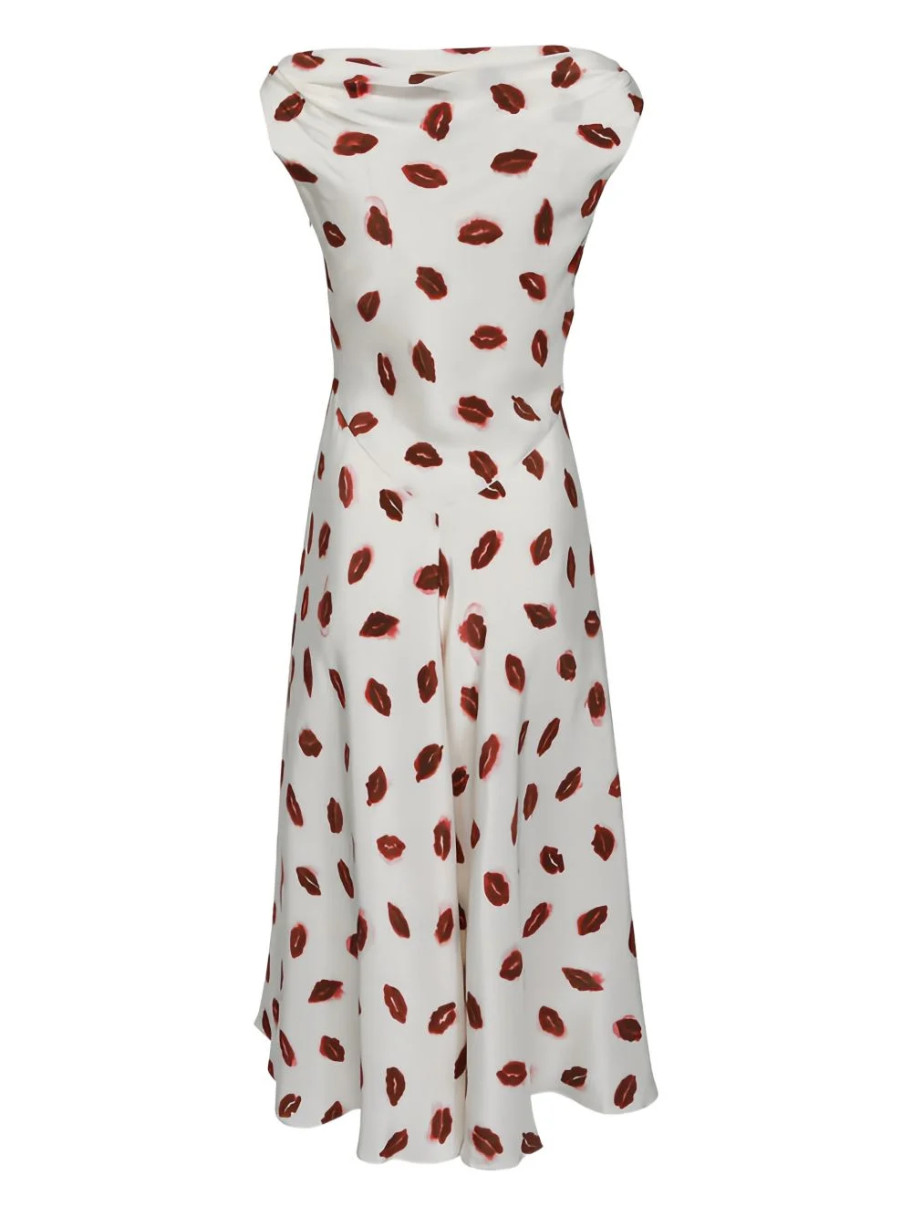 Drina midi dress Highlights - Ivory white - Lips print - Cowl neck - Sleeveless - Flared skirt Made in Italy Composition Silk 100% Washing instructions Read Manufacturer Guidelines