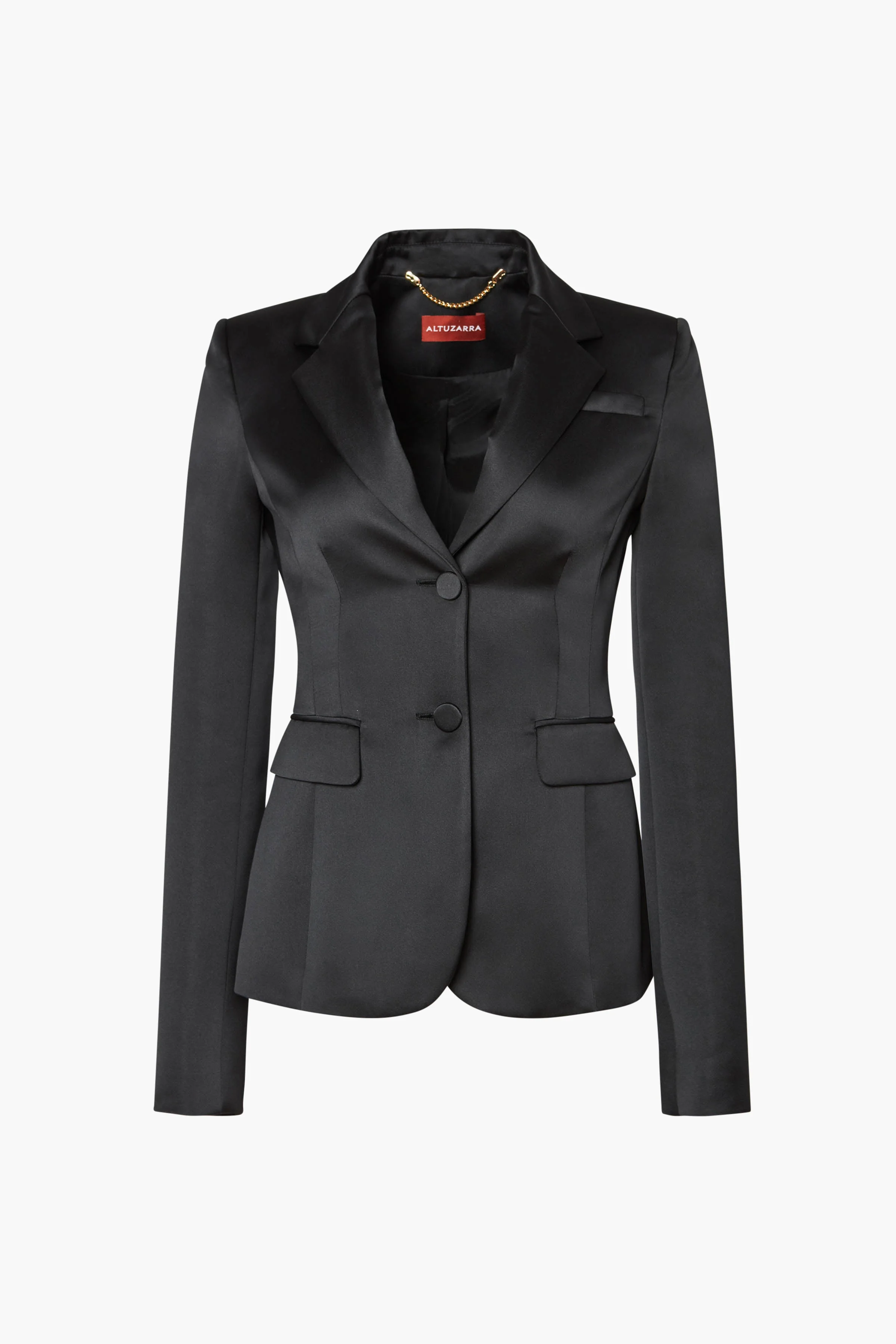 The Fenice Jacket is a classic suiting style, cut to a slim silhouette with structured shoulders and a neatly tailored waist. It has high notched lapels, a single jet chest pocket and flap front pockets. Details Notched lapels Single-breasted button front closure Long sleeves Jet chest pocket Flap front pockets Double back vent 48% Acetate, 45% Polyamide, 7% Elastane Made in Italy Model is 5'9" and is wearing a size 36