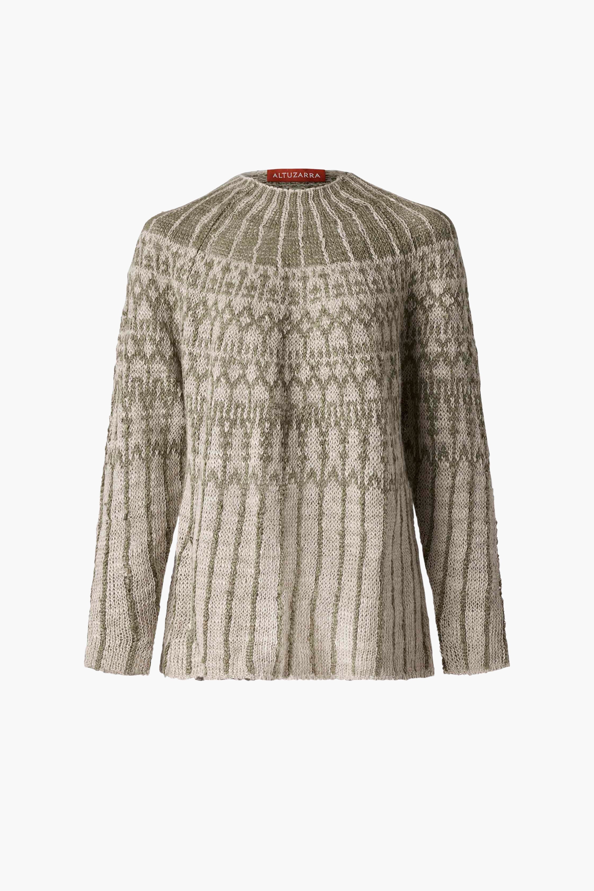 The Flick sweater is knitted from a flax blend for a luxurious and soft handle. It features a monochromatic Fair Isle pattern with a high neck and long sleeves. Details '- 95% European flax, 5% Nylon GRS