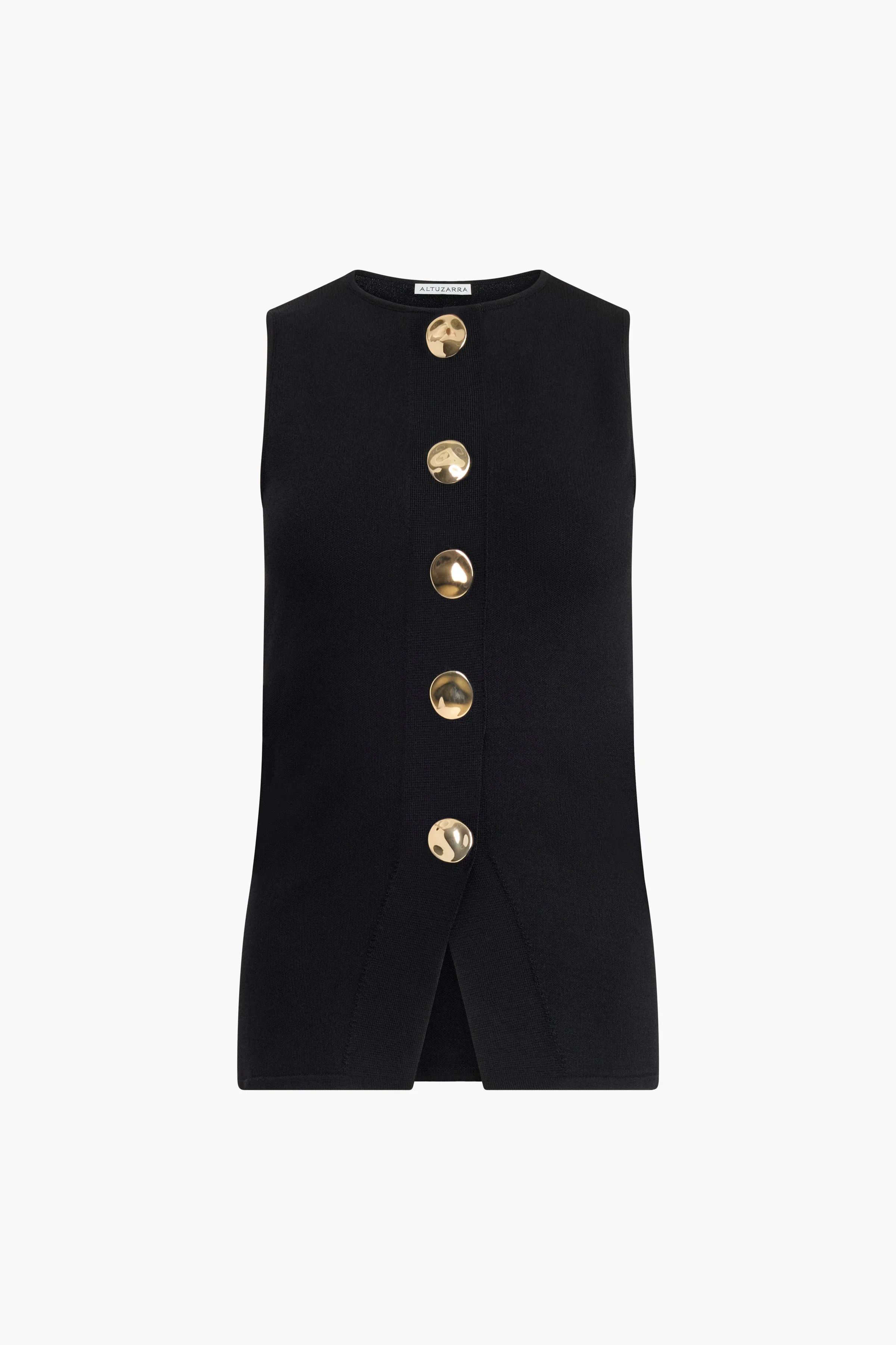 The Happer Top is designed with a sleeveless silhouette and a round neckline. It features a front button closure with gold-tone buttons and subtle shaping through the waist. Details '- 75% Rayon Viscose 25% Polyamide Fiber Made in Turkey