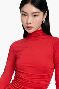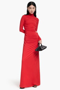 The Jazmina dress is the definition of sophisticated evening wear. Shaped from stretch jersey, it features a roll neck, long sleeves, and ruched detailing down the front. Details '- 92% Recycled Polyester 8% Elastane. Made In Portugal