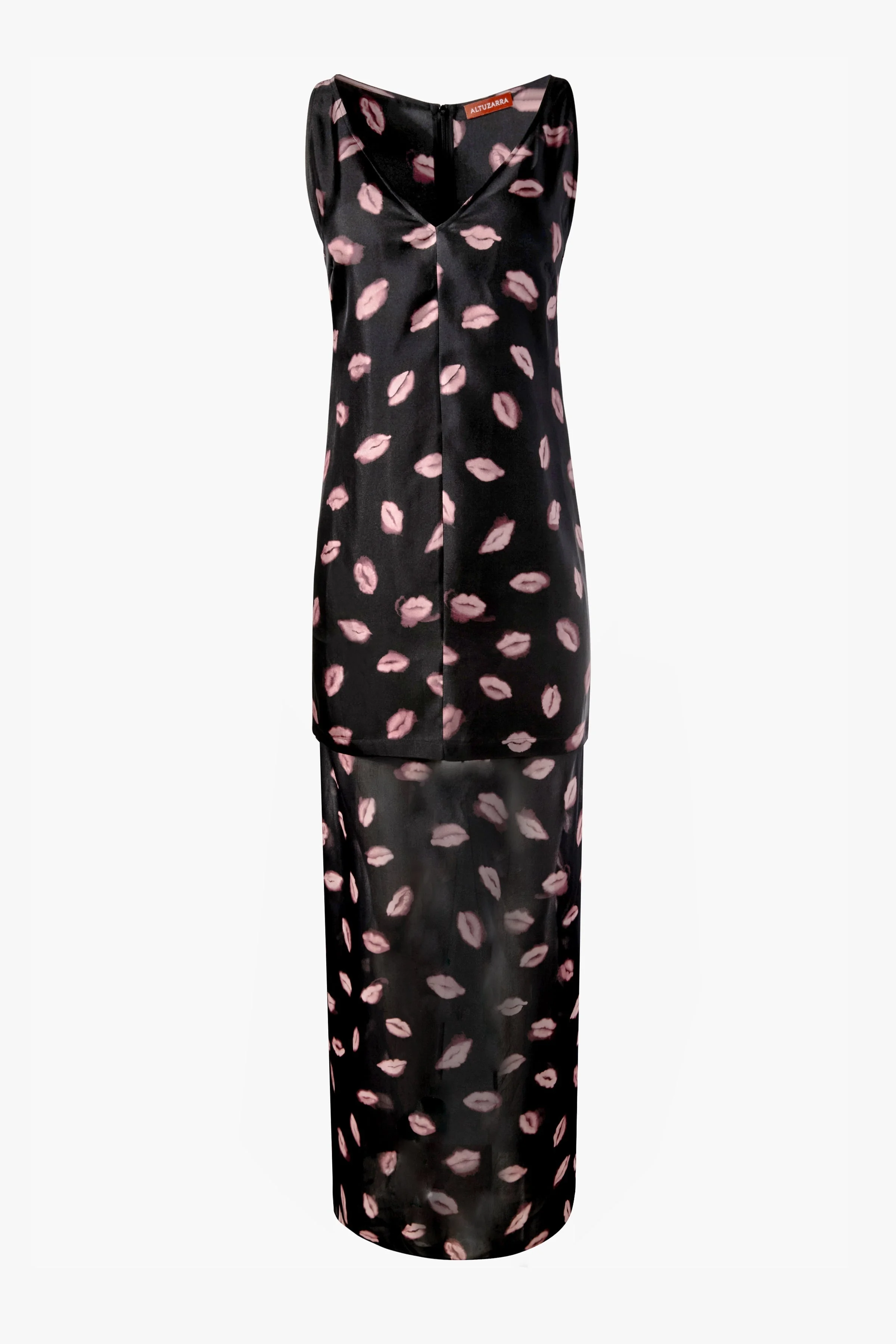 The Katrin dress showcases Altuzarra's FW25 inspiration, drawing from deeply personal artifacts such as letters, mementos, diaries. Shaped from silk, i'ts detailed with smudged kisses resembling marks left on a napkin. Details 100% Silk. Made in Italy