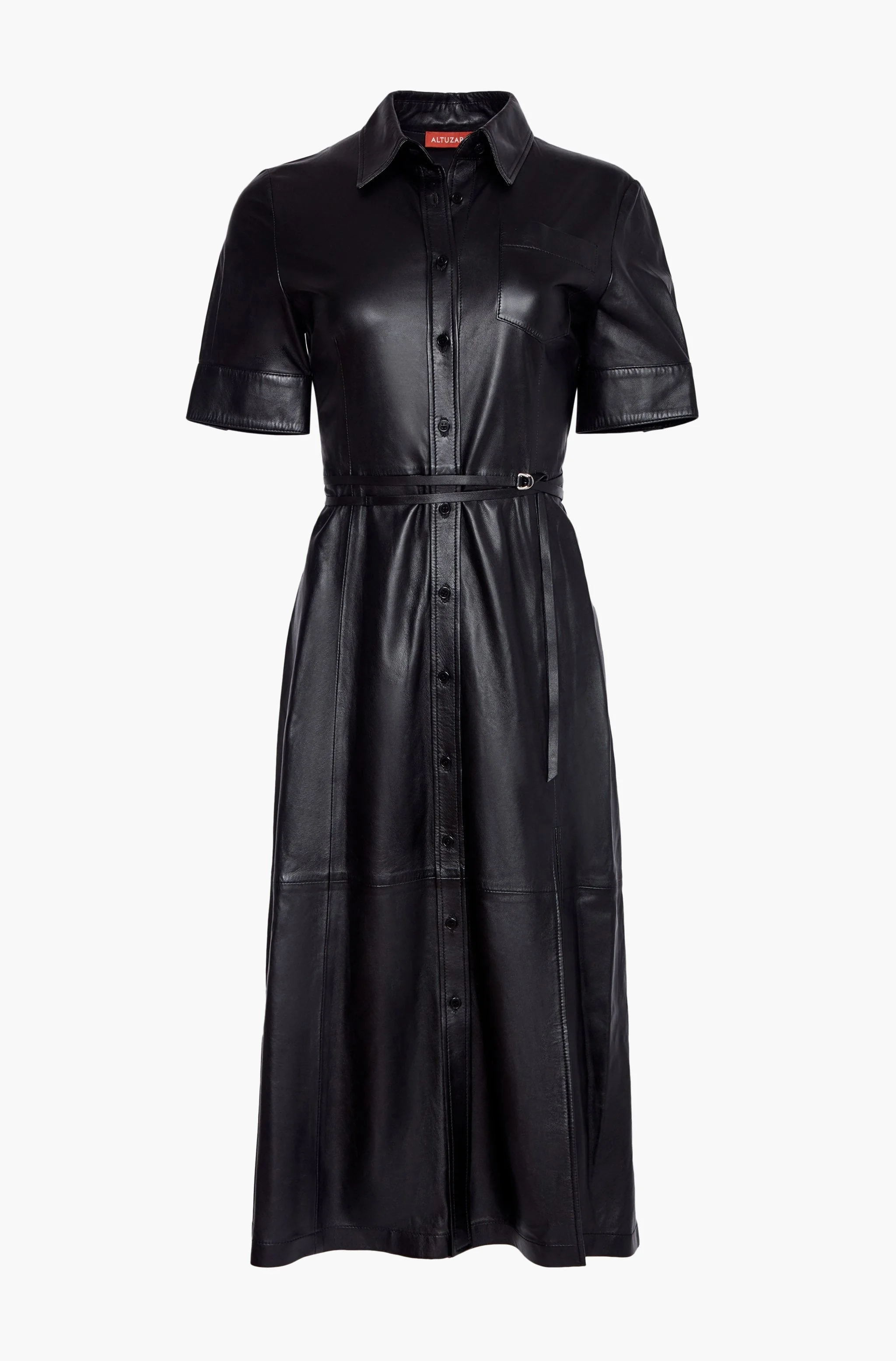 The Kiera Dress is cut from soft lambskin leather to a classic A-line silhouette with a small point collar and short sleeves. Its detailed with a slim buckled waist belt. Details Point collar Short sleeves Button detailing Slim leather waist belt with buckle fastening Mid length 100% Lamb Leather Made in Turkey Model is 5'10" and is wearing a size 36