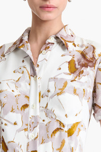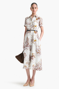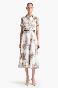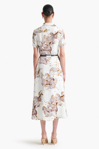 The Kiera dress features an airy A-line silhouette. Designed with a small point collar and short sleeves, it's detailed with a slim leather waist belt. Details 100% Silk. Made in Italy