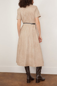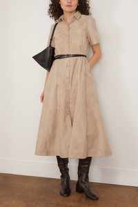 The Altuzarra Kiera Dress is a timeless addition to your wardrobe. This shirtdress features a feminine fit and flare silhouette in beautiful soft lambskin leather. Wear yours with flats and a shoulder bag. FIT DESCRIPTION MODEL MEASUREMENTS - Fits true to size, take your normal size - Shirtdress - Midi length - Fit and flare silhouette - Point collar - Belted waist - 100% Lamb Leather - Taylor is wearing a size 34/ 2 US - Bust: 33.5" - Waist: 27.5" - Hips: 36.5" - Height: 5’9”