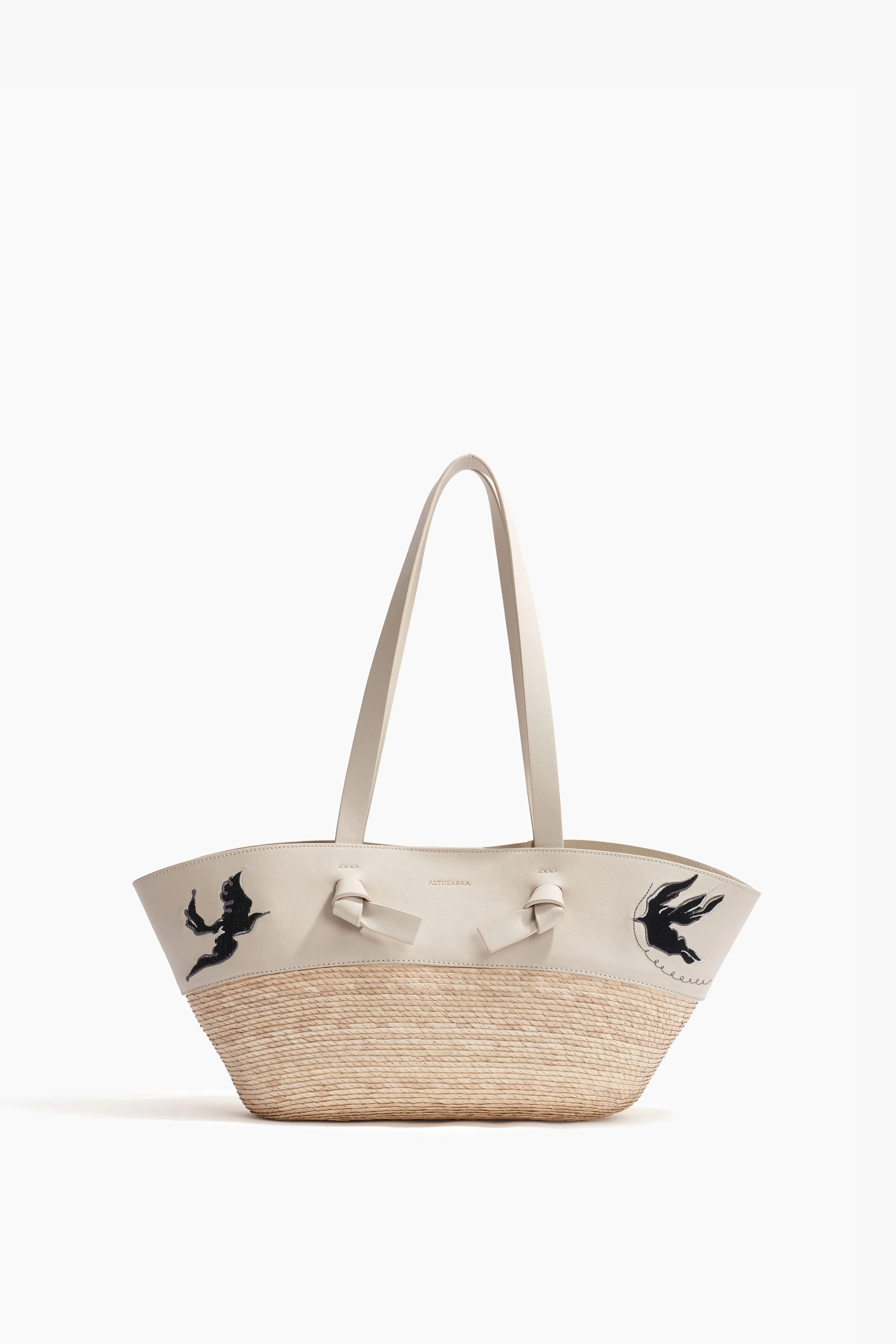 This embroidered Knot bag is crafted from woven palm with calf leather trim. Made in Spain, it features leather top handles and embroidered bird motifs along the upper edge. Details 90% Palm. 10% Calf Leather. Made in Spain. Depth: 11.5 cm / 4.5 in Top Width: 56 cm / 22 in Botton Width: 37 cm / 14.5 in Height: 19.5 cm / 7.7 in Handle drop: 30 cm / 11.8 in