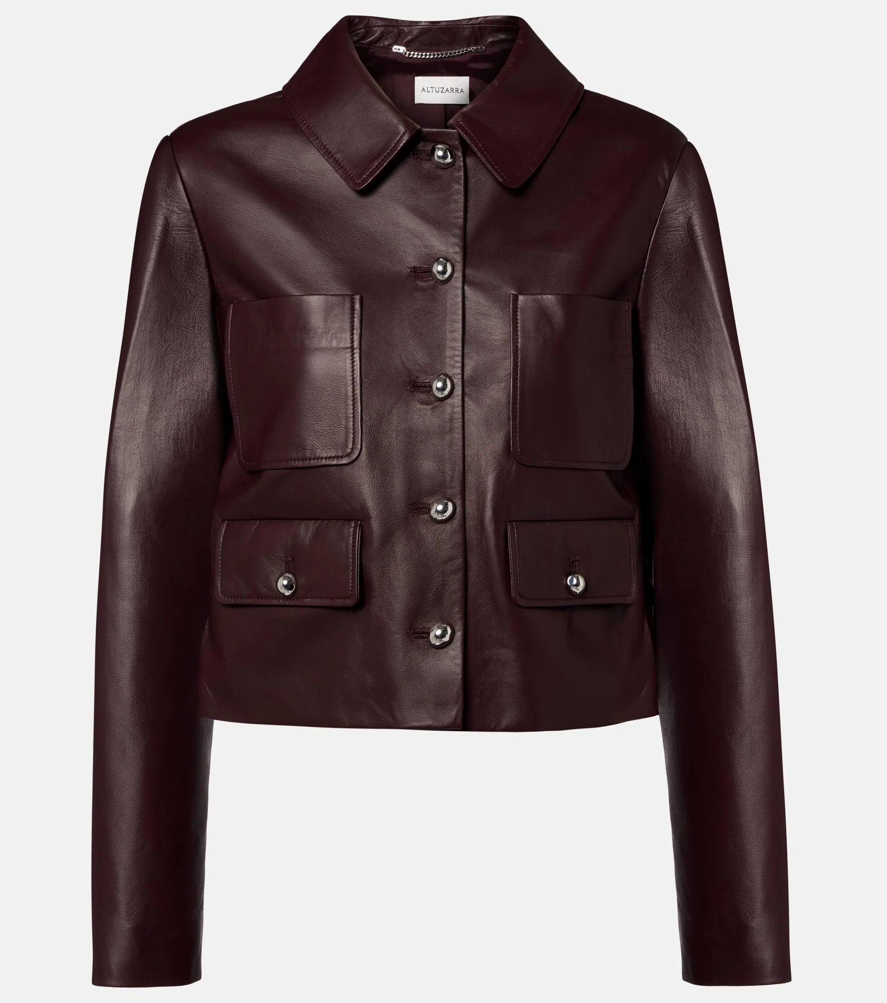Informed by founder Joseph Altuzarra’s multicultural upbringing, each Altuzarra piece speaks to the power of considered elegance. This jacket is crafted from supple leather and boasts buttoned front closure and front pockets. Product Details - Material: 100% lamb leather - Care instructions: dry clean - Made in Turkey - Color: burgundy - Designer color name: Maroon - Lining: 67% viscose, 33% polyester - Closure: buttoned front - Pockets: buttoned pockets, patch pockets - Item number: P01144206 Size & Fit - True to size - Shoulder pad inserts - Straight fit - Non-stretchy fabric - Slightly cropped - The model seen in the picture is 178cm-5'10" and wearing a size FR 36