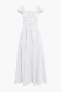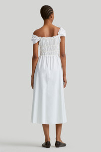 The Lily dress is cut from a soft cotton blend to a flattering smocked construction. Designed with hidden pockets and a side slit, this off-the-shoulder silhouette is both elegant and whimsical. Runs large, recommended to take a size down. Details Ruched bodice Off-the-shoulder neckline Midi length Side slit 70% Cotton, 30% Polyester Made in Italy Model is 5'11" and is wearing a size 36