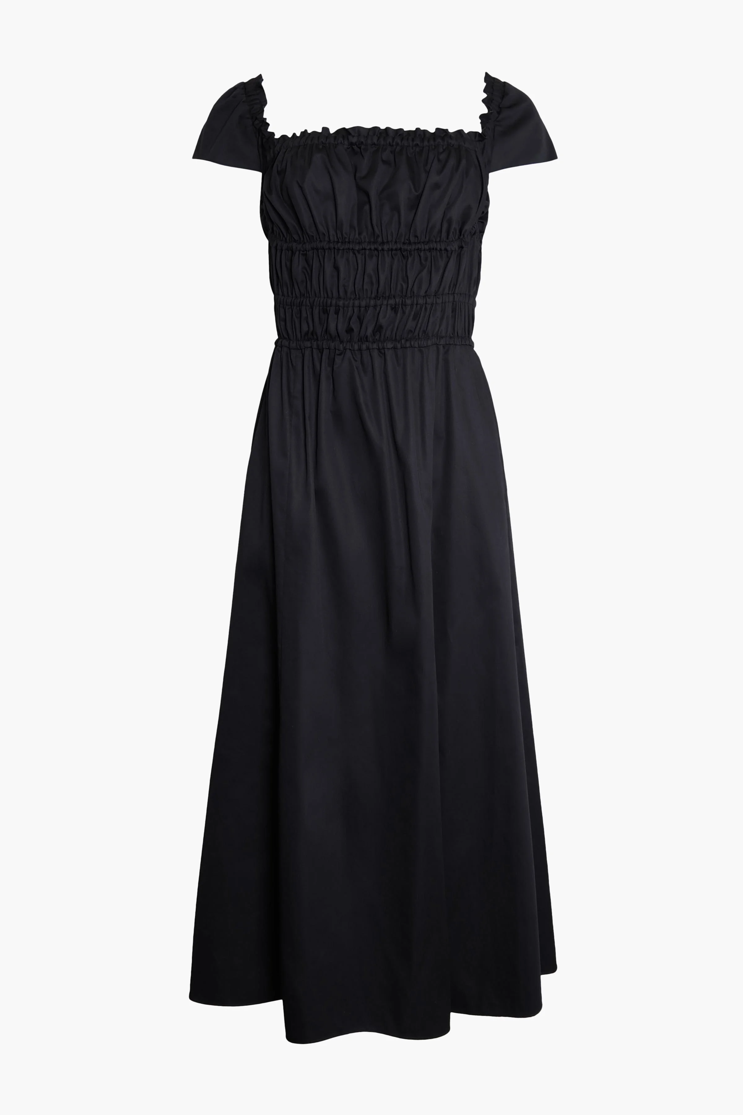The Lily dress is cut from a soft cotton blend to a flattering smocked construction. Designed with hidden pockets and a side slit, this off-the-shoulder silhouette is both elegant and whimsical. Runs large, recommended to take a size down. Details Ruched bodice Off-the-shoulder neckline Midi length Side slit 70 % Cotton, 30% Polyester Made in Japan Model is 5'11" and is wearing a size 36