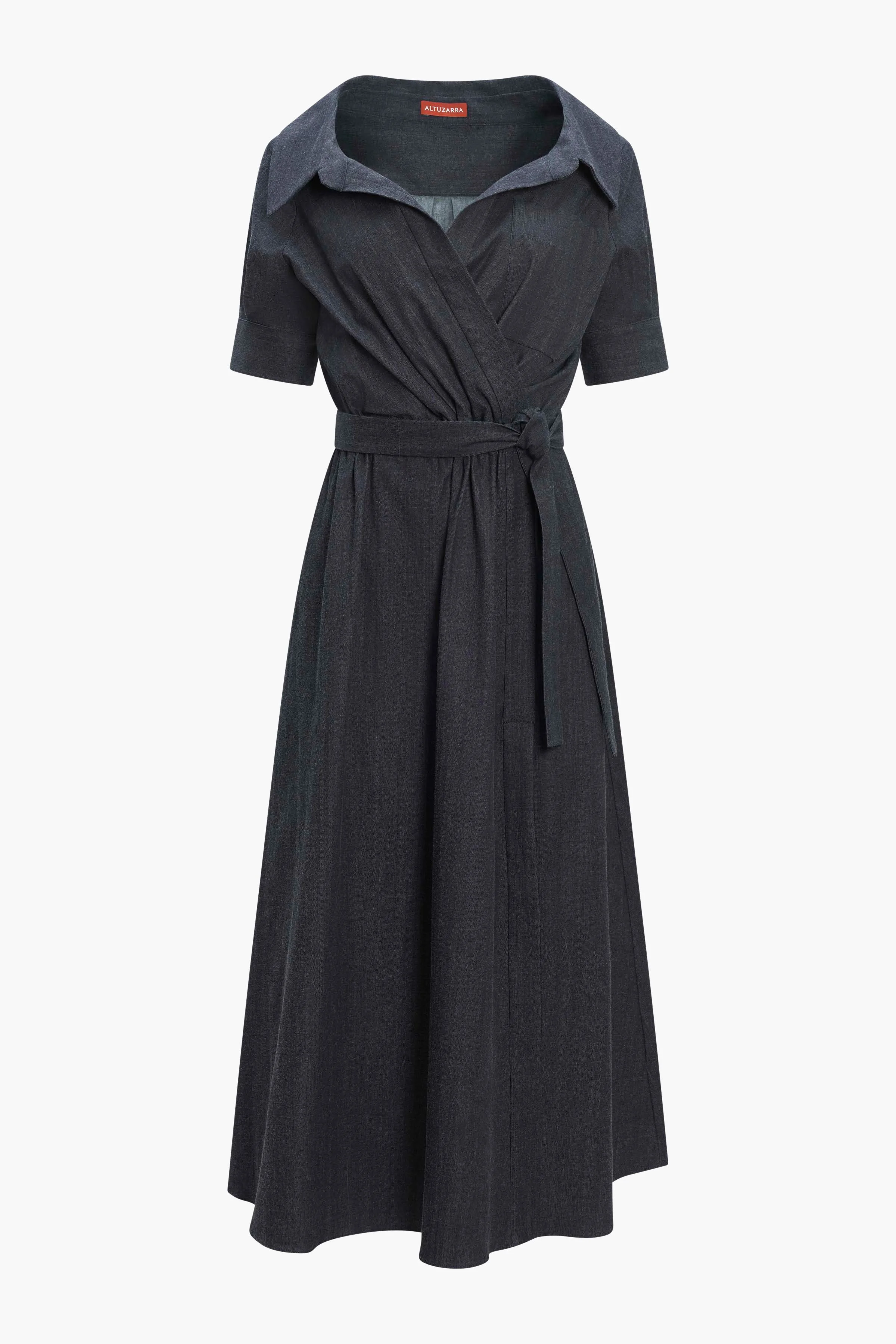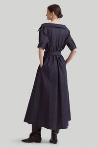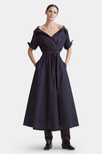 The Lydia dress is designed from denim cotton in a relaxed midi silhouette with an elasticized waist. The frock has an open collared neckline and on-seam pockets that exude undone ease. Details Pointed collar Front chest pocket Elasticated waist Front slit 70% Cotton, 30% Polyester Made in Italy Model is 5'10" and is wearing a size 36