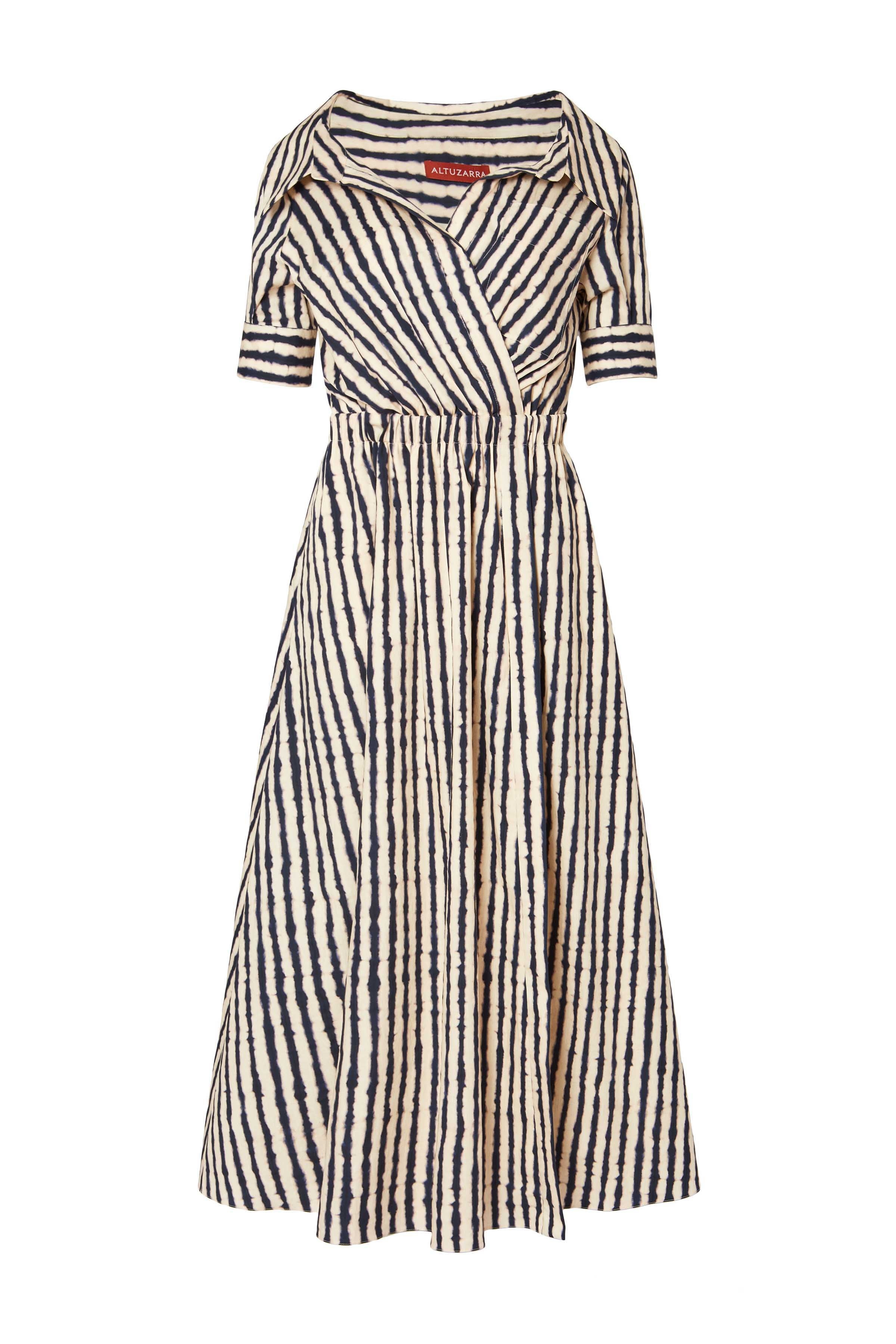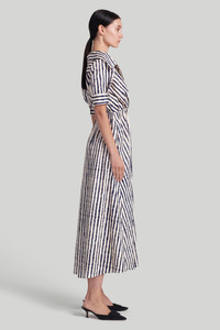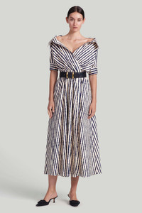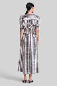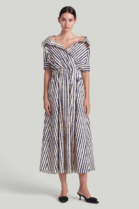 The 'Lydia' dress is designed from airy cotton poplin in a relaxed midi silhouette with an elasticized waist. The frock has an open collared neckline and on-seam pockets that exude undone ease. Details - Pointed collar - Front chest pocket - Elasticated waist - Front slit - 97% Cotton, 3% Spandex - Model is 5'10" and is wearing a size 36