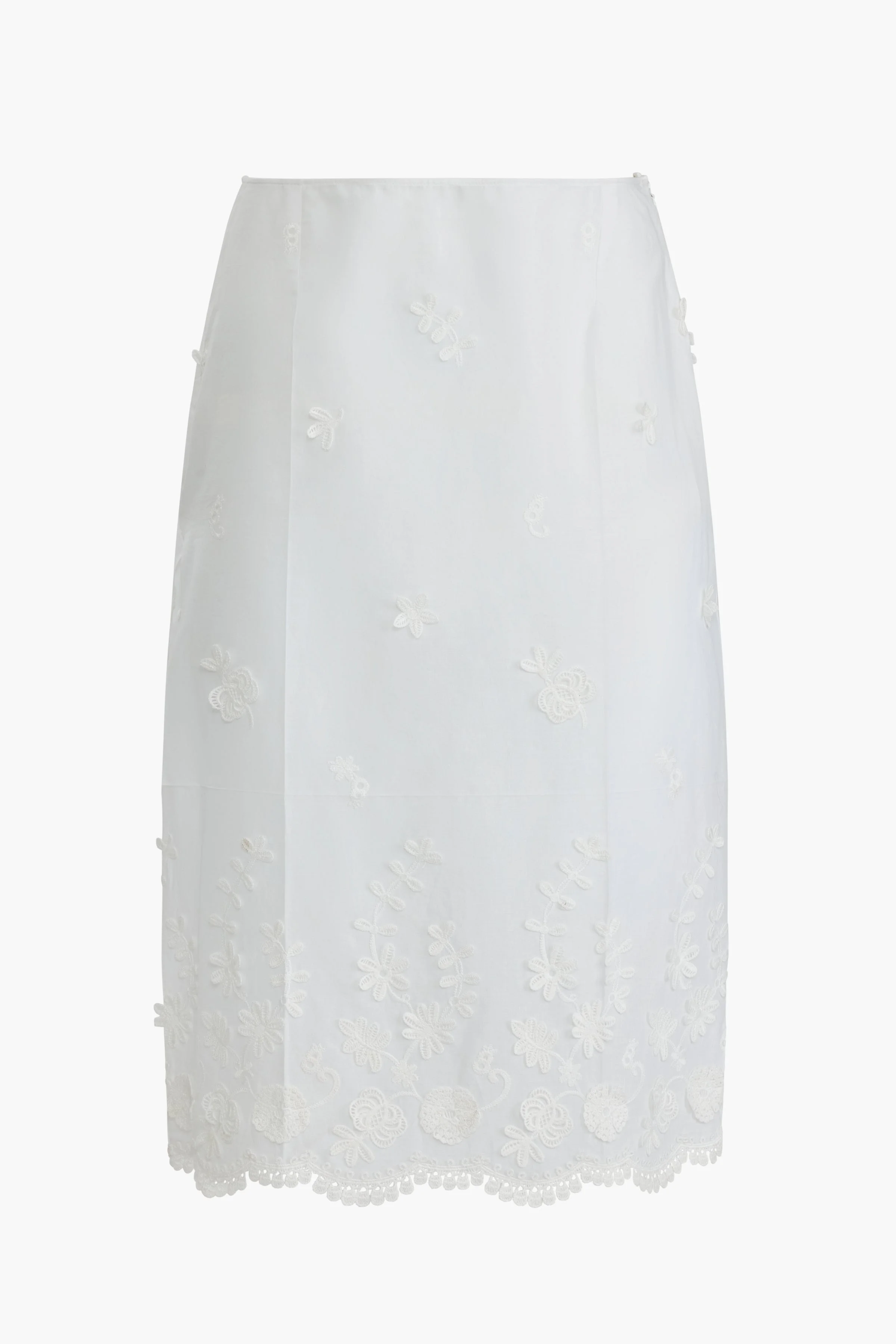 The Malik Skirt is designed with a clean, straight silhouette and falls to a knee-length hem. Tonal floral embroidery decorates the fabric, while the hem is finished with delicate scalloped detailing. Details Base 100% Cotton, Embroidery 100% Polyester Made in Italy