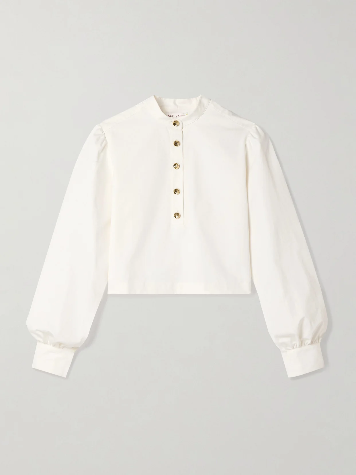 Altuzarra's 'Margot' top is cut from crisp cotton-blend poplin and has a boxy, cropped shape with gently puffed sleeves. The row of gold-tone buttons have been carefully hammered by hand, so they catch the light just so.