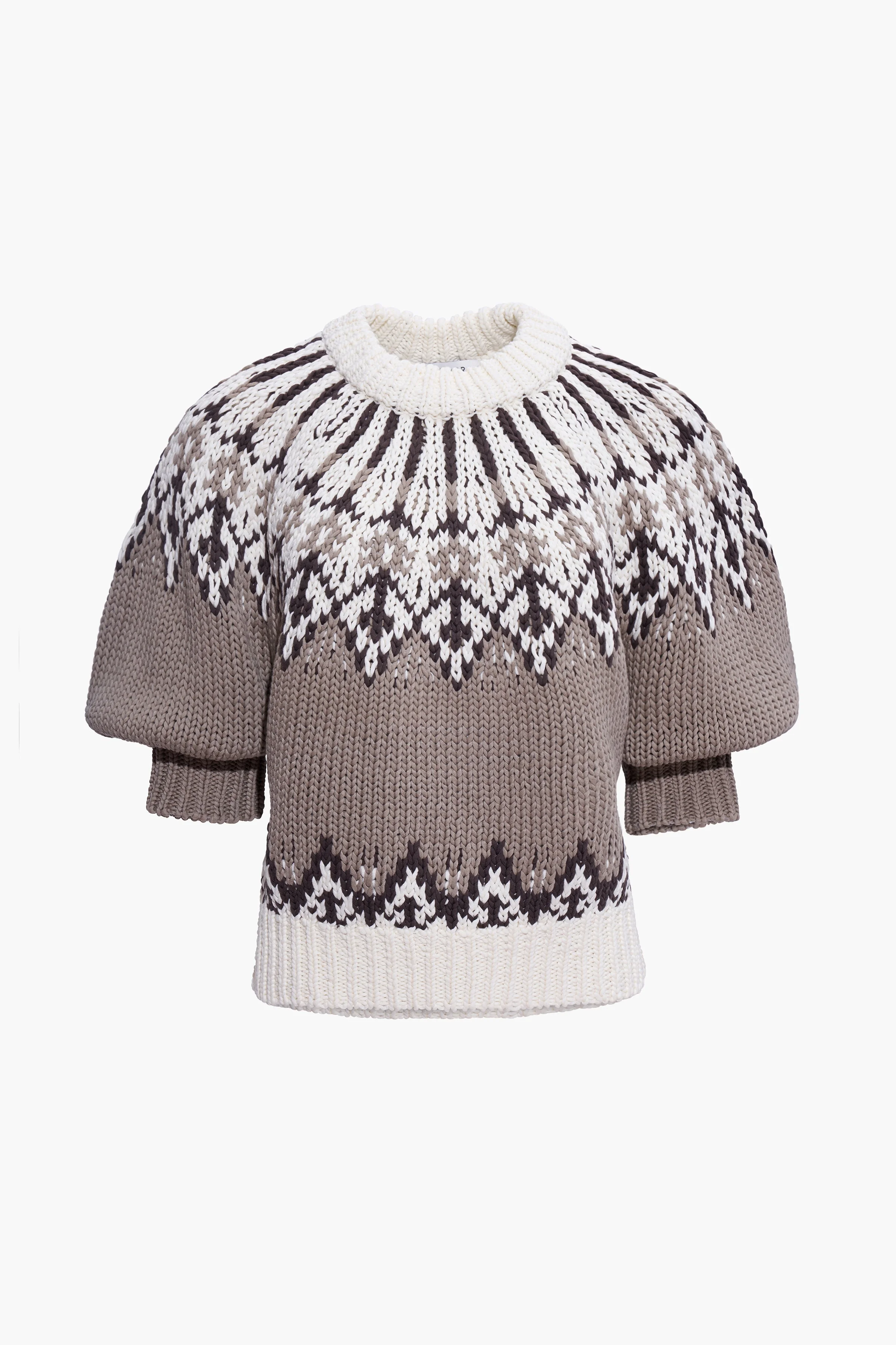The Marty sweater is designed with a traditional Fair Isle pattern. Knitted from a soft Mako cotton, typically used for It's exceptional fineness and silky feel, it's shaped for a looser fit with half balloon sleeves. Details 100% Mercerised Cotton Mako