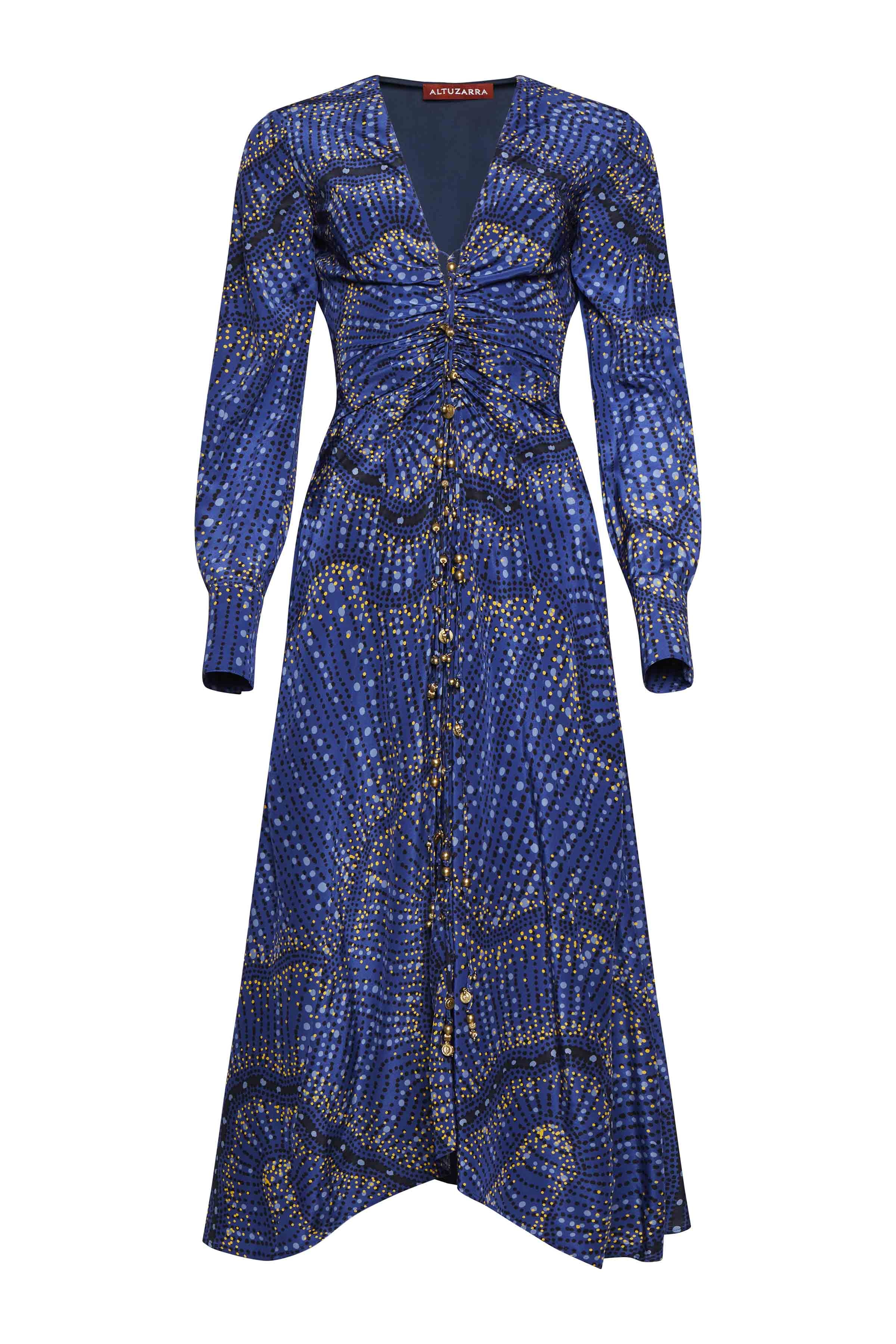 The ‘Mila’ dress is cut in Italy from pure silk to a fluid mid-length silhouette. Designed with a flattering gathered waist, it features a psychedelic print in varying dot patterns and is embellished with gold-tone charms at the neck ties. Details - Midi length - Long sleeves - Ruched details - V neckline - 100% Silk - Model is 5'10" and is wearing a size 36