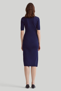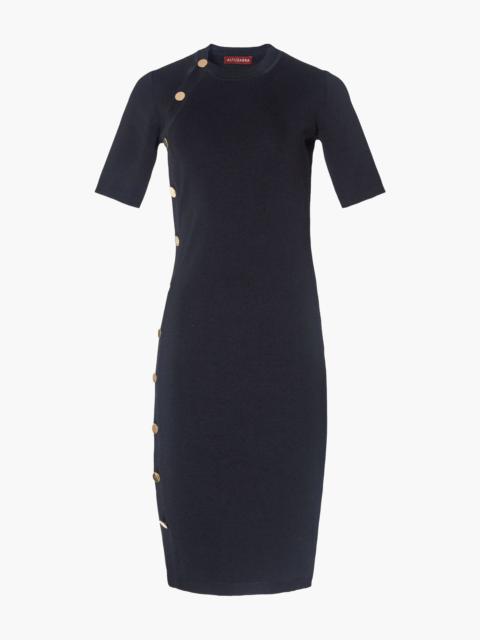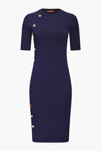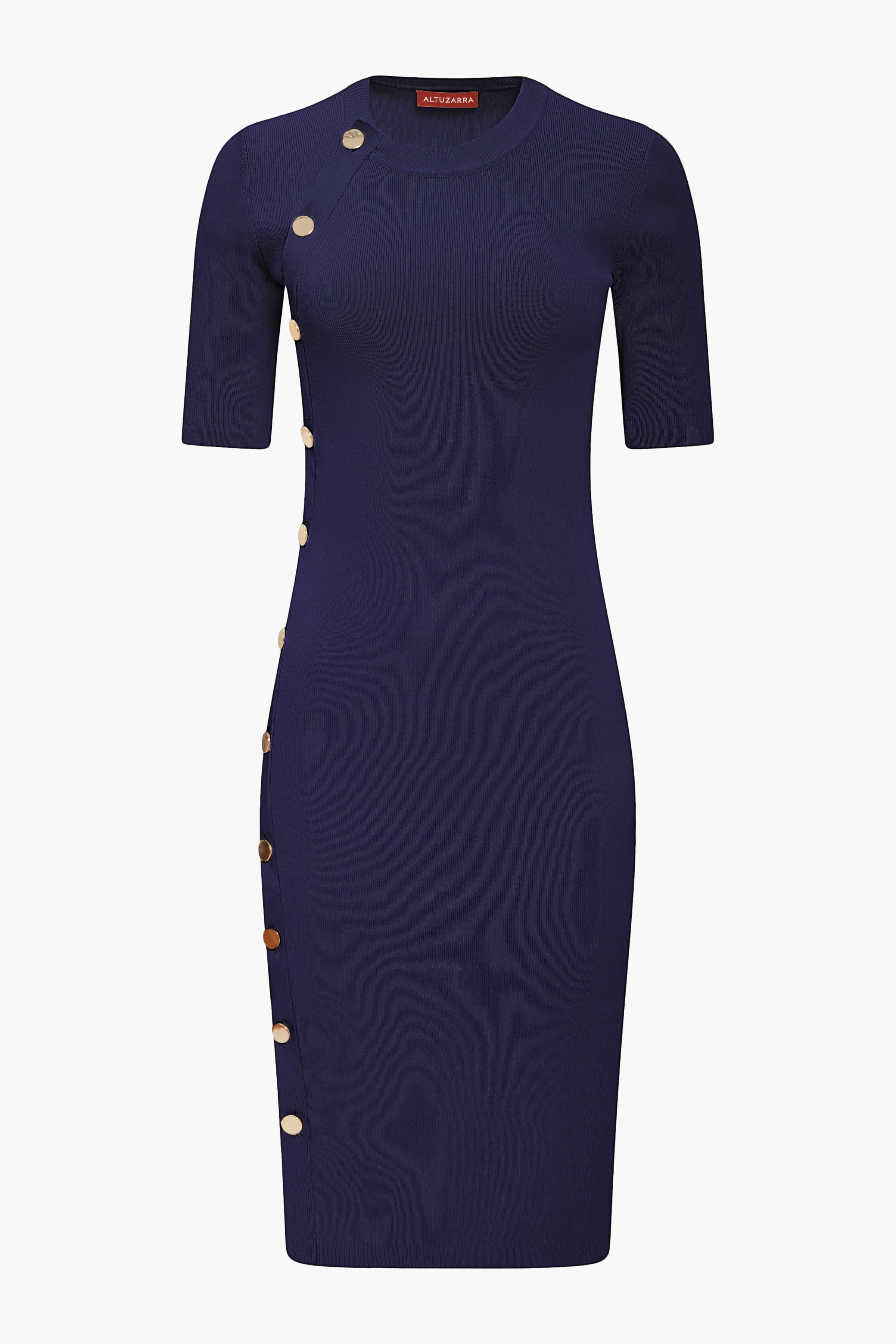 The Minamoto Knit Dress is a signature Altuzarra style cut to a slim fit with a round neckline and short sleeves. Features an asymmetric line of gold-tone metal buttons and a side slit at the hem. Details Gold-tone metal buttons at side Crew neck Short sleeves Side split 63% Viscose, 37% Nylon Model is 5'9.5" and is wearing a size XS