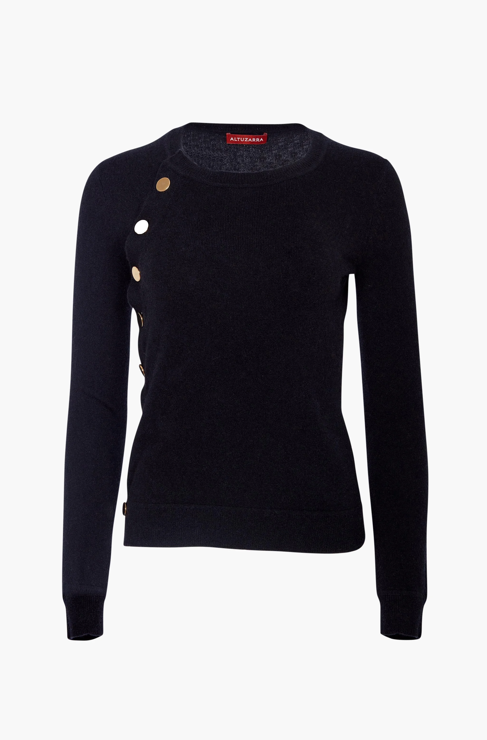 The Minamoto Knit Top is a signature Altuzarra style crafted from pure cashmere to a slim fit with an asymmetrical line of gold-tone metal buttons at one side. It has a round neckline, long sleeves and ribbed trims. Details Round neckline Button side closure Long sleeves Ribbed trims 100% Cashmere Model is 5'9.5" and is wearing a size XS