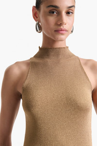 The Mitzi Dress has a dramatic maxi silhouette with a turtle neck. It's beautifully shaped to a close-fitting silhouette from viscose jersey that has a metallized fibre running through for a subtle sheen. Details 79% Viscose, 17% Metallic Fiber, 4% Polyester