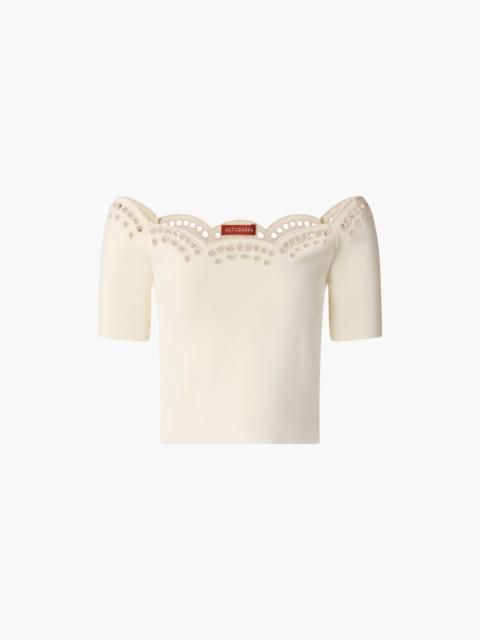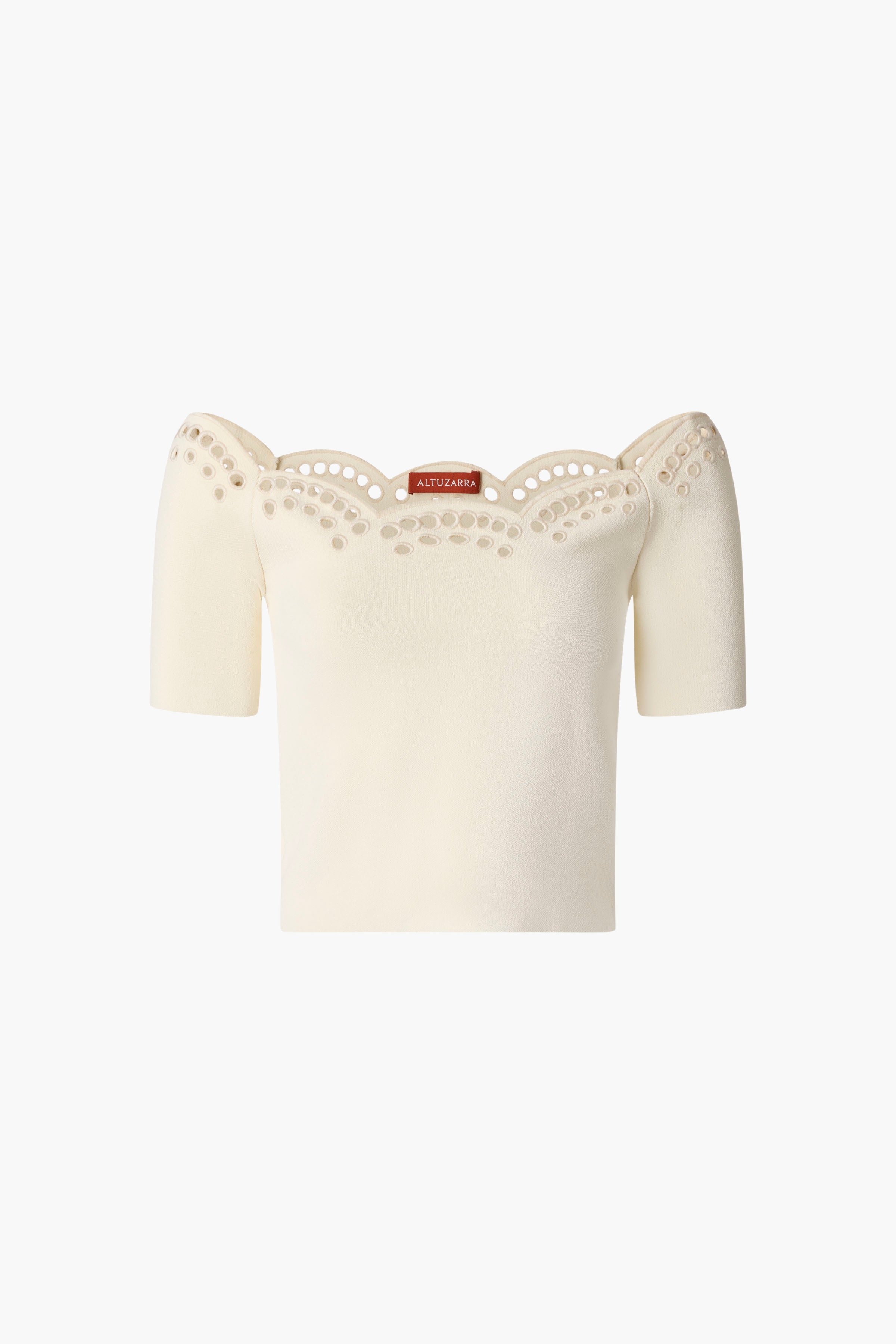 The Posy top is shaped to an off-the-shoulder silhouette, defined by a scalloped trim and circle cut outs. The close-fitting style is designed with half sleeves. Details '- 75% Rayon viscose, 25% Elite Polyester