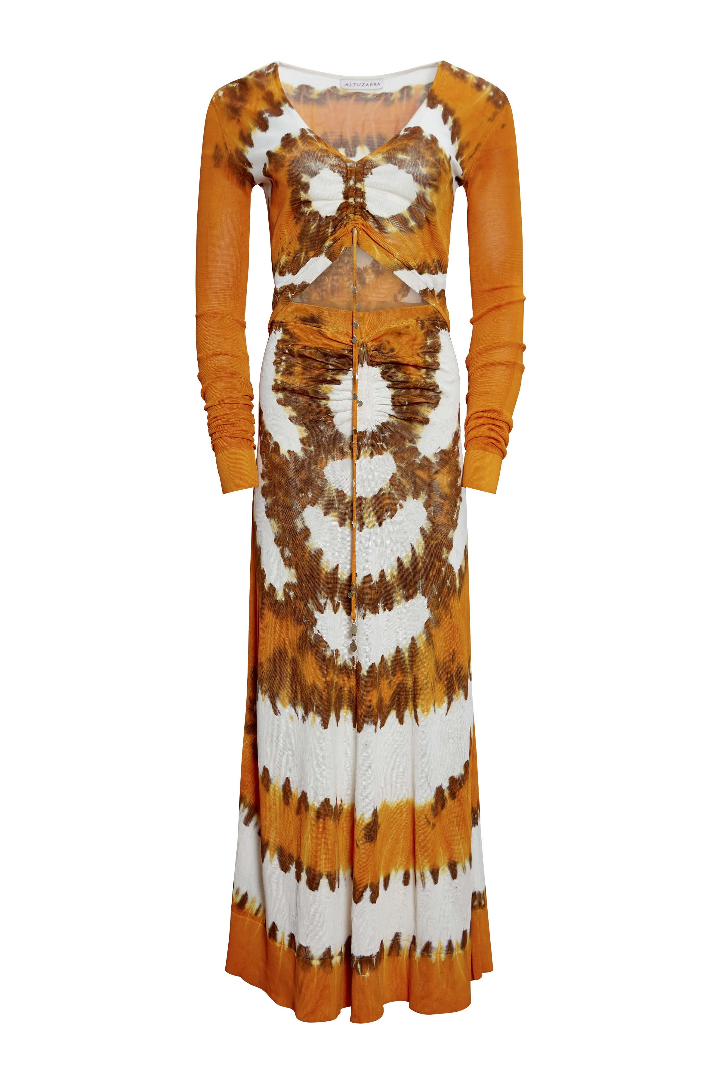 The 'Rilia' dress is knit into a figure-skimming midi silhouette that is hand dyed through a traditional Shibori process—an Altuzarra signature. Its cropped design is emphasized by ruched drawstrings at the hem and waistline. Details - Midi-length - Ruched detailing at hem and waistline - Long Sleeves - 100% Viscose - Model is 5'10" and is wearing a size S