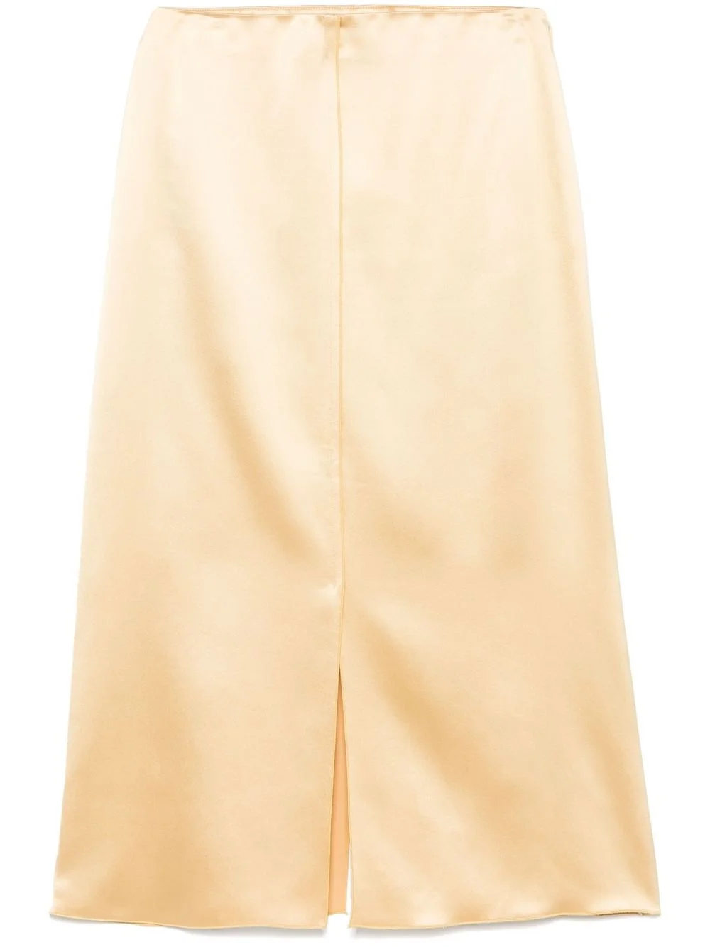 satined midi skirt Highlights - Amber yellow - Concealed side zip fastening - Front slit - Rear slit Made in Italy Composition Silk 100% SIZE & FIT Model measurements Height 5 ft 11 in(1.8 m) Bust/Chest 31.49 in(80 cm) Hips 36.61 in(93 cm) Waist 24.4 in(62 cm) FittingInformation This midi-length skirt is intended to be worn just below the waist The vented hem offers movement at the rear Made from a lightweight non-stretch fabric