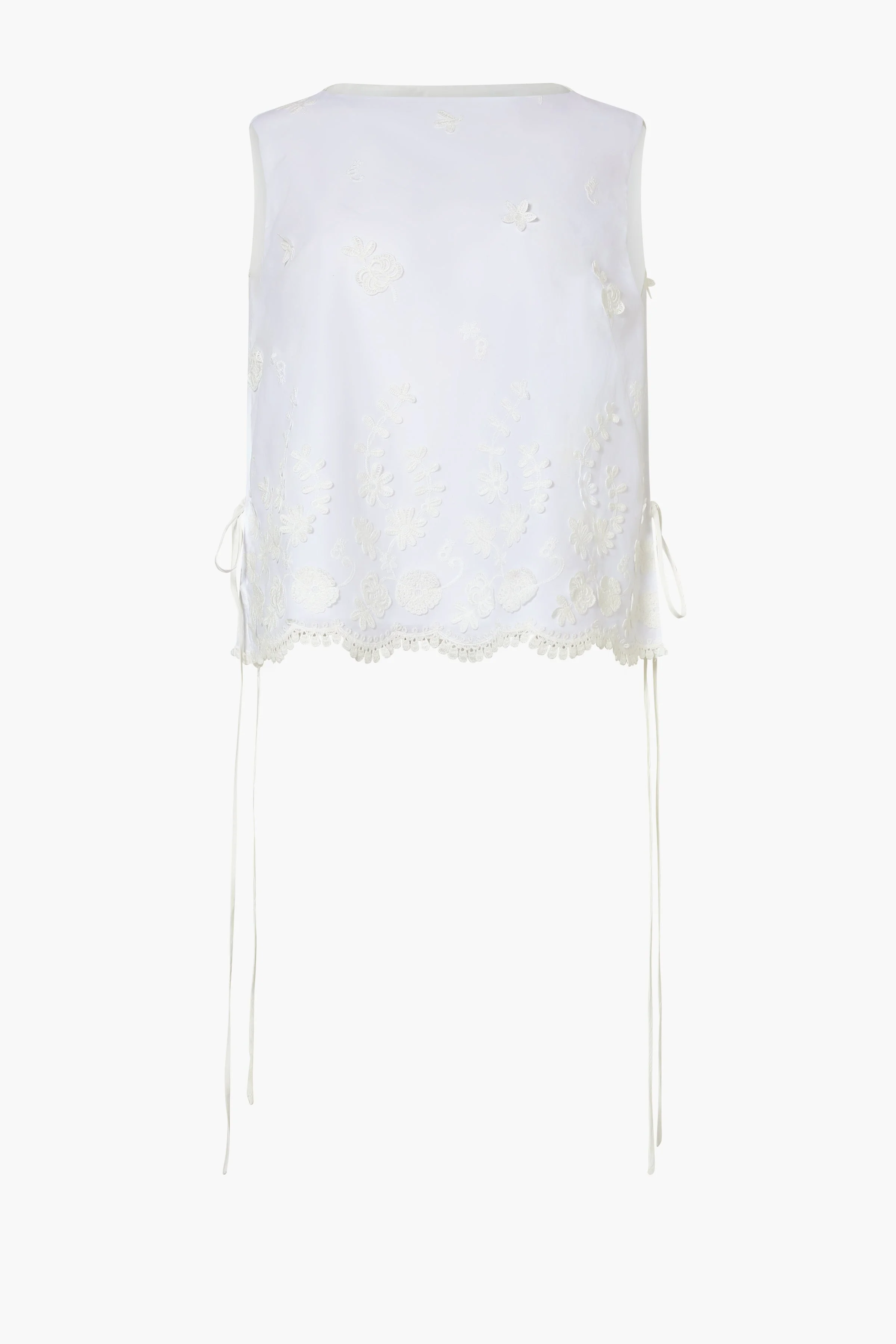 The Siggi Top is designed with a relaxed, sleeveless silhouette and a wide neckline. Side ties create subtle shaping through the body. Tonal floral embroidery adds texture to the design. Details Base 100% Cotton, Embroidery 100% Polyester Made in Italy