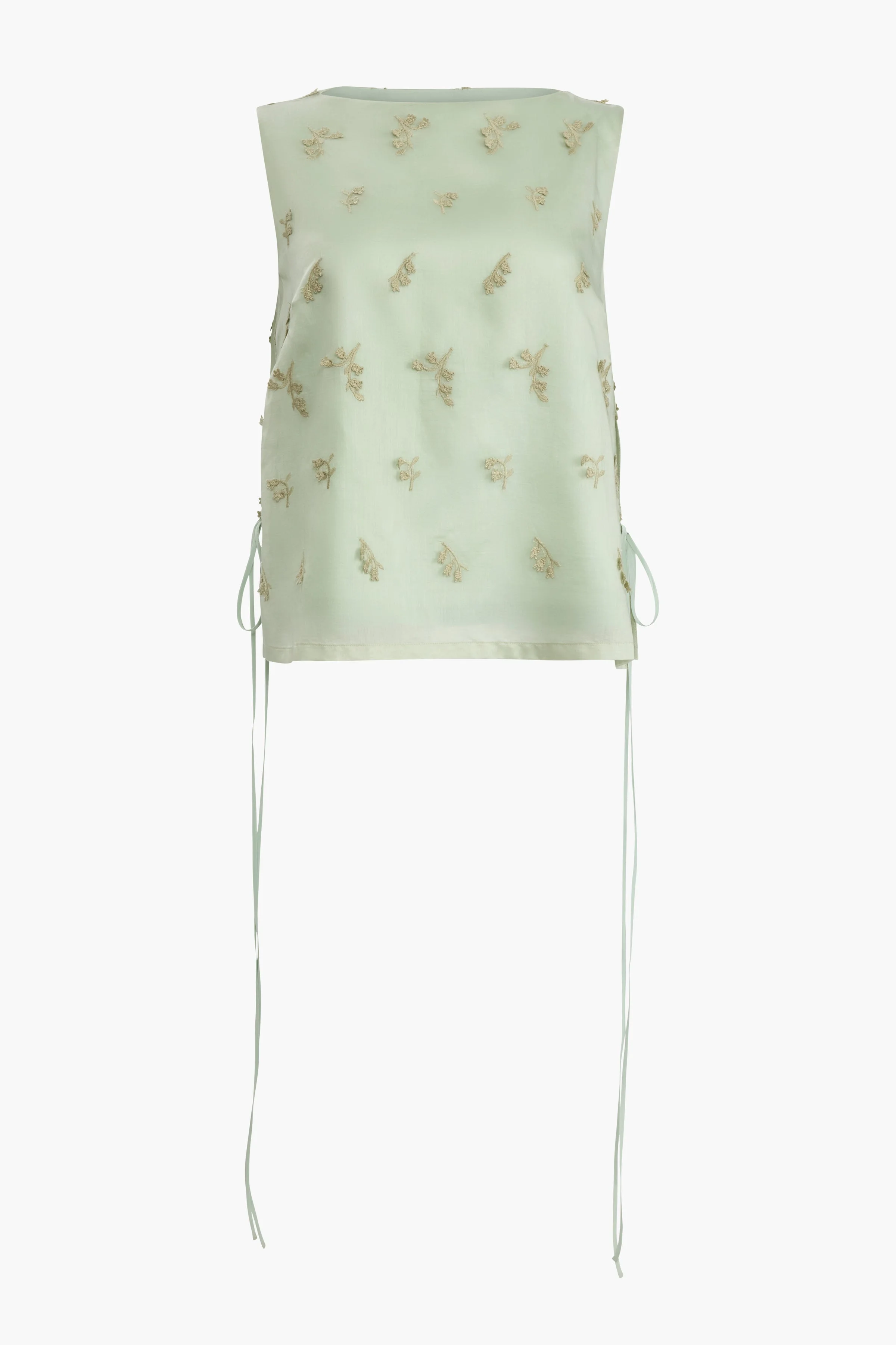 The Siggi Top is designed with a relaxed, sleeveless silhouette and a wide neckline. Side ties create subtle shaping through the body. Tonal floral embroidery adds texture to the design. Details 100% Polyester Made in Italy