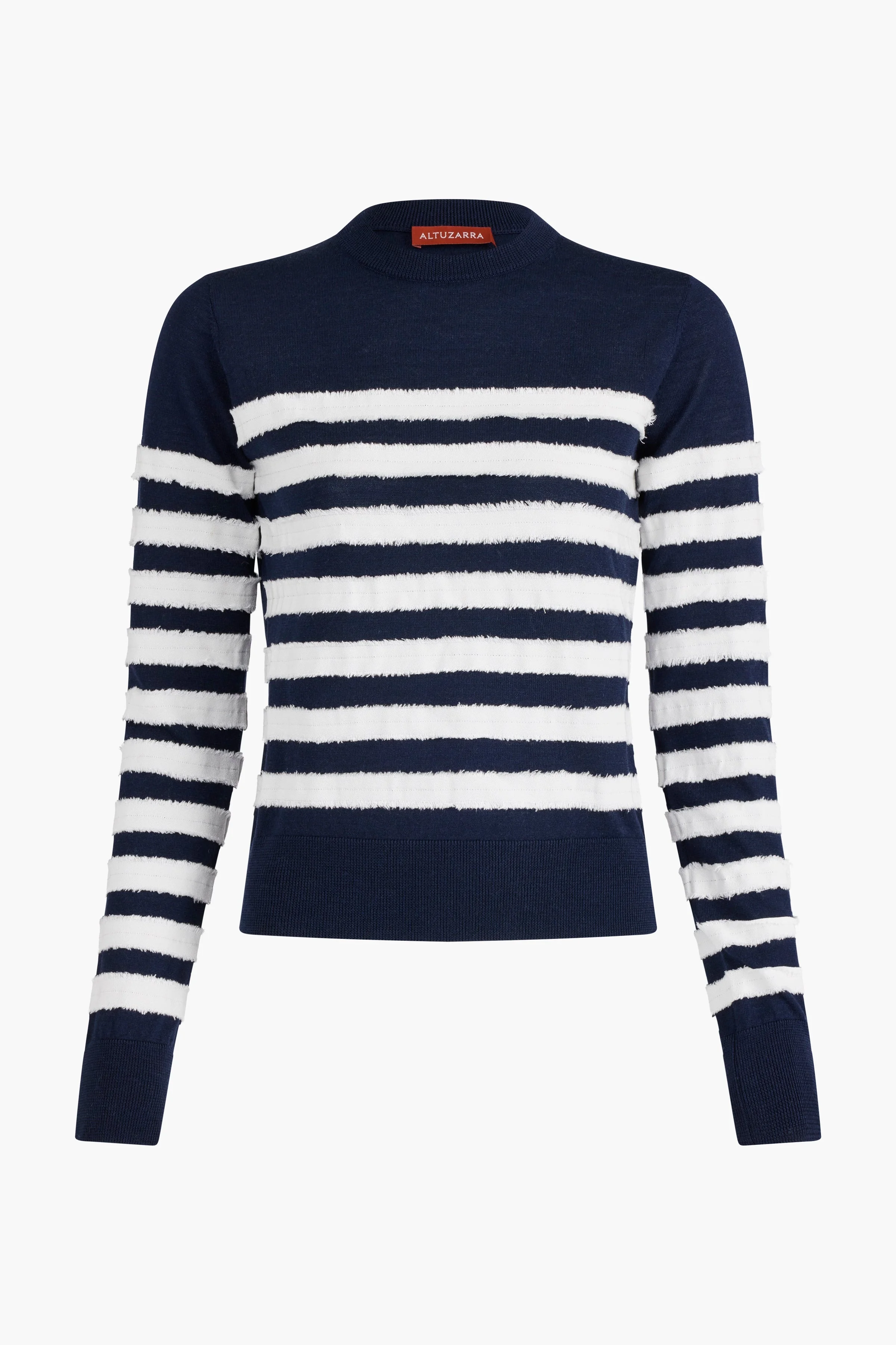 The Skippy sweater is aptly named thanks to the maritime stripes and navy-blue hue. It's made from a luxe blend of merino and silk with ribbed knit trims. Details 70% Merino 30% Silk
