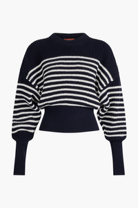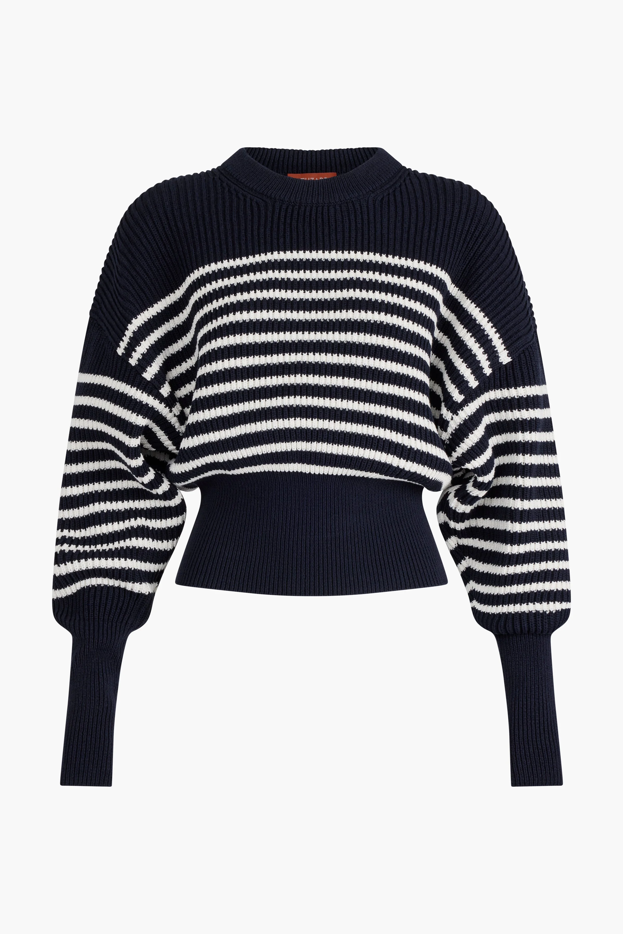The Tanessa sweater draws inspiration from maritime designs, knitted from navy cotton with contrasting white stripes. It features extended cuffs and hemline creating a voluminous bodice and sleeves. Details 100% Cotton