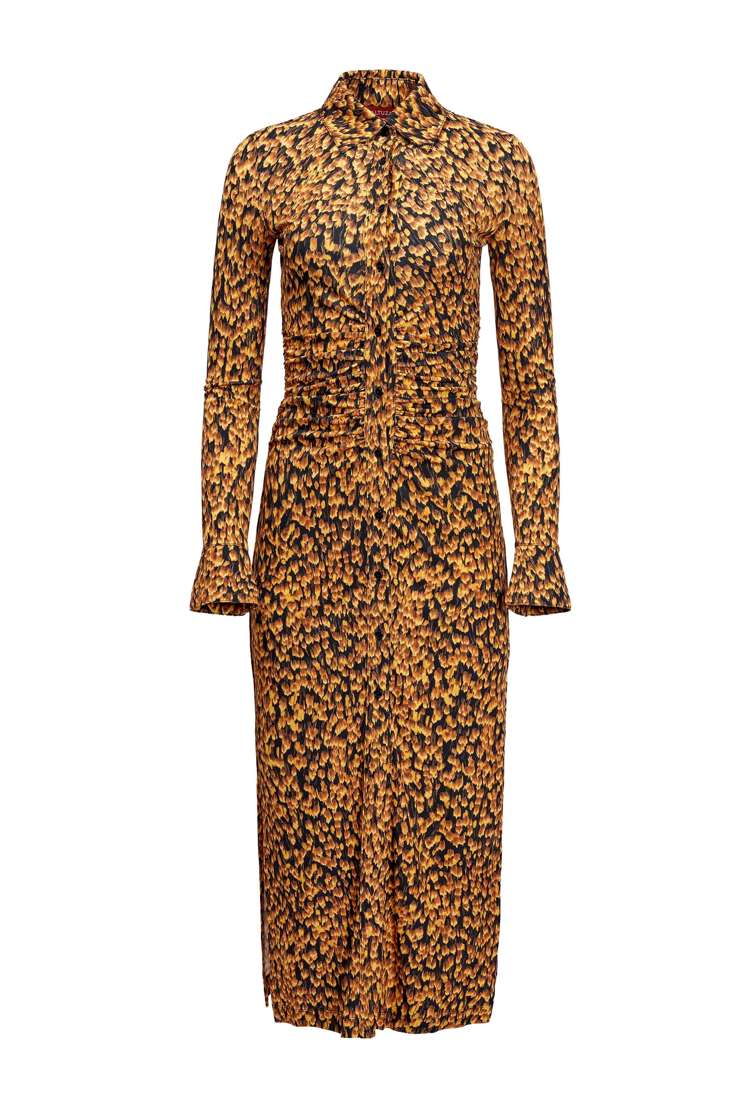 The ‘Claudia’ dress is cut from ribbed stretch for a slim fit with waist-flattering ruching at the hips. Lustrous molten buttons through front offer styling versatility and ease. Complete with side slits. Details - Point collar - Button front closure - Long sleeves with button cuffs - Side slits - Mid length - 100% Viscose - Model is 5'10" and is wearing a size 36