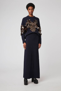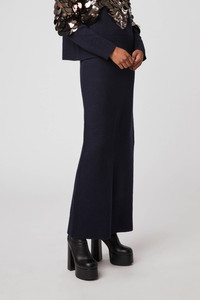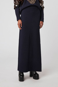 The 'Yarrow' skirt is softly knit into a relaxed maxi silhouette with a cozy ribbed trim. Complete with a deep side slit. Details - Maxi silhouette - Ribbed trim - Side slit - 34% Wool, 34% Polyamide, 29% Viscose, 3% Polyester - Made in Hong Kong - Model is 5'10" and is wearing a size S