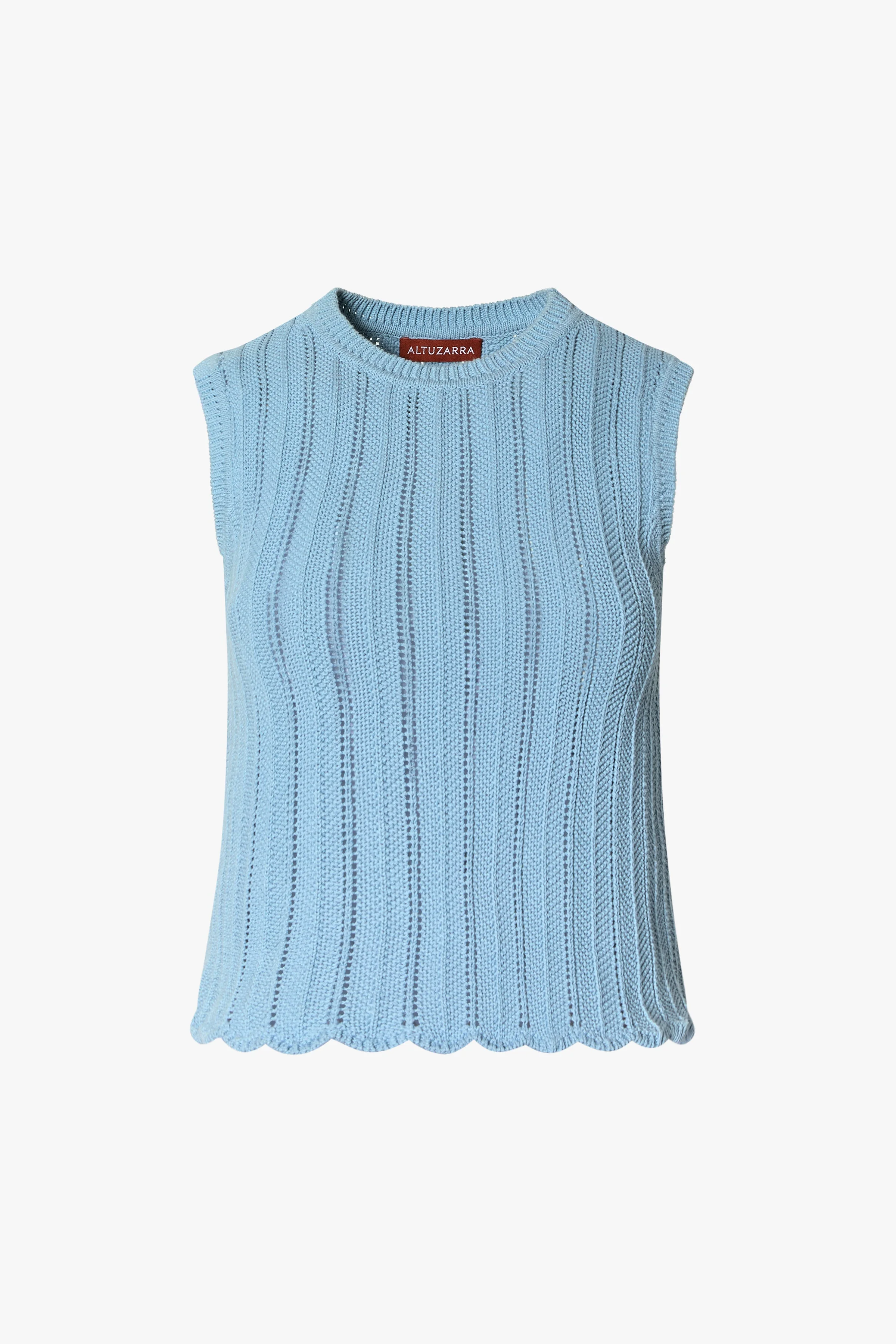 The Zabou Top is knitted from cotton with a ripple stitch finish and breathable open construction. It is designed with a sleeveless silhouette and a round neckline. Details 100% Cotton