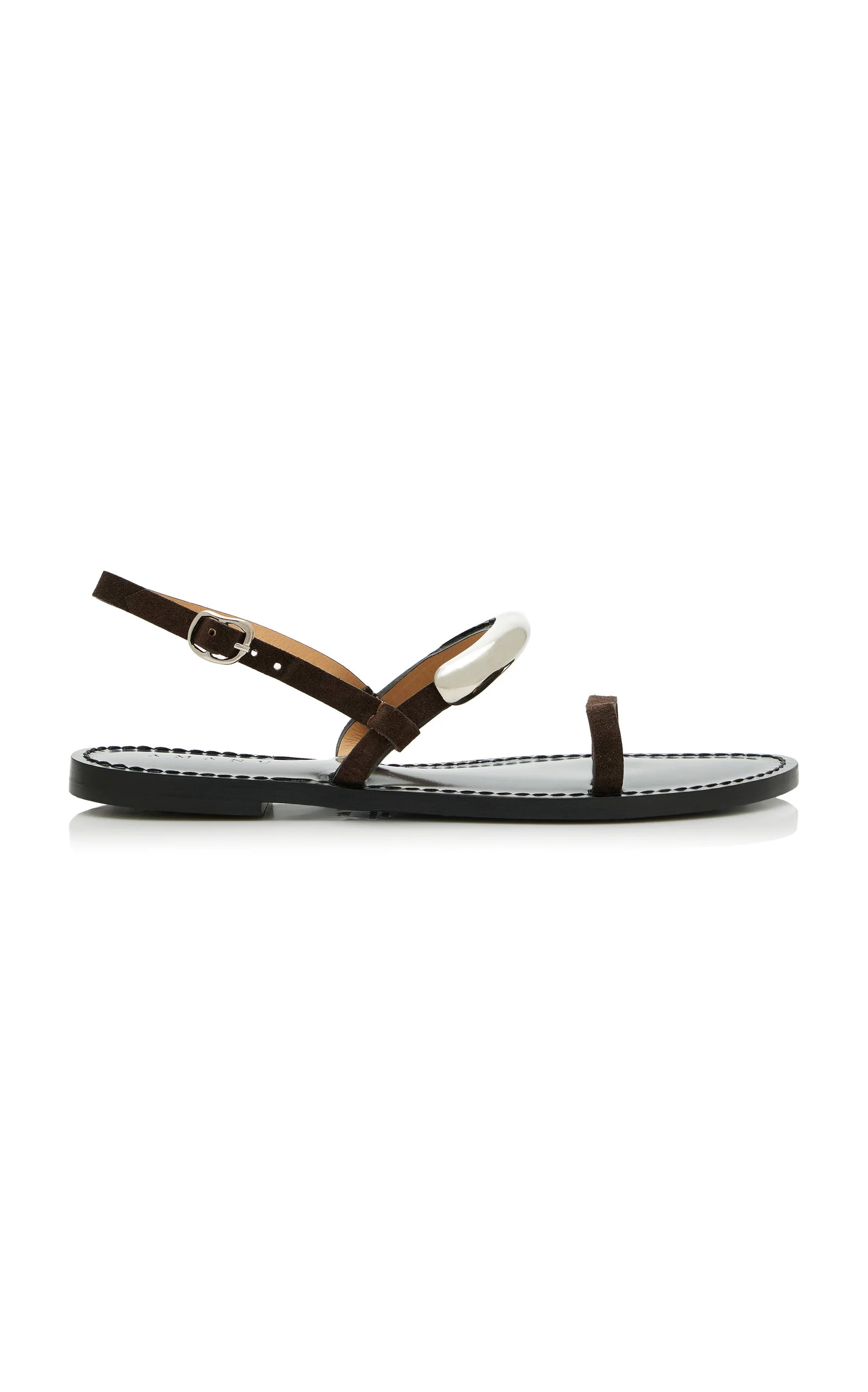 Anita Patrickson channels her love of Africa (she grew up on a farm out in the bush), her reverence for Mother Earth, and her appreciation for conscious craftsmanship into impossibly chic handmade sandals. To ensure minimum excess waste, each pair is made to measure using the finest leather sourced from Florence—which is then painted by hand—as well as hides that are by-products and vegetable-dyed. Handmade from two-tone suede, the 'Ghana' sandals have a sleek, minimal body adorned with a silver-plated hardware. PRODUCT DETAILS - Buckle fastening - Composition: suede - Designer color: Chocolate - Made in the USA