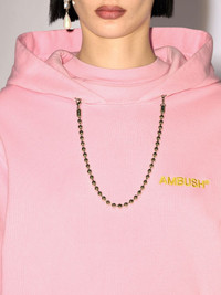 This hoodie features a detachable ball-chain accessory across the neck and AMBUSH® logo embroidery on the chest. Product ID: BWBB001F24FLE0013616 SIZING Model Tat wears size S Height: 5’ 11” (180 cm) Bust: 31.5” (80 cm) Waist: 24" (63 cm)