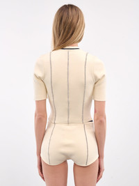 AMBUSH top in off-white, cotton-nylon blend, paneled construction, contrast topstitching, v-neckline, rib-knit collar, chest logo embroidery, short sleeves, straight hem, slim fit. Made in Italy 72% Cotton 26% Polyamide 2% Elastane Standard Sizing Model is 5'9" wearing size S. Bust: 32" Waist: 23" Hips: 34"