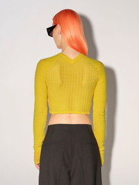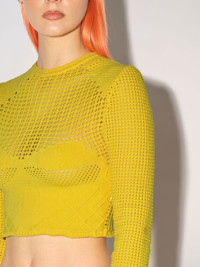 Yellow crochet cropped knit top featuring all-over net detailing. Product ID: BWHE019F22KNI0011800 SIZING MODEL MARTINA WEARS SIZE M HEIGHT: 5’ 8” (178 CM) BUST: 33” (84 CM) WAIST: 24” (61 CM) HIPS: 35” (90 CM) MATERIAL FABRIC 83% POLYAMIDE 17% ELASTAN
