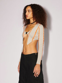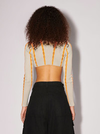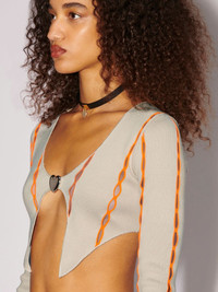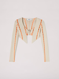 This beige crop knit cardigan with orange openwork knit detailing features a branded silver heart buckle as closure, as well as a symmetric v-shaped hem. Product ID: BWHB019S23KNI0010120 SIZING MODEL SOPHIE WEARS SIZE XS HEIGHT: 5’ 83” (178 CM) BUST: 32” (82 CM) WAIST: 25” (64 CM) HIPS: 35” (89 CM) MATERIAL FABRIC 5% POLYAMIDE