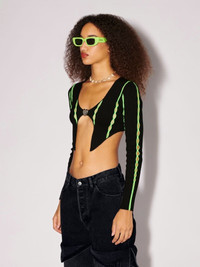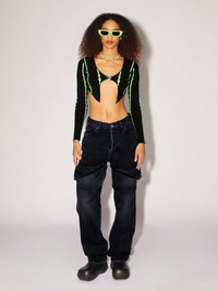 This black crop knit cardigan with green openwork knit detailing features a branded silver heart buckle as closure, as well as a symmetric v-shaped hem. Product ID: BWHB019S23KNI0011054 SIZING MODEL SOPHIE WEARS SIZE XS HEIGHT: 5’ 83” (178 CM) BUST: 32” (82 CM) WAIST: 25” (64 CM) HIPS: 35” (89 CM) MATERIAL FABRIC 24% POLYESTER