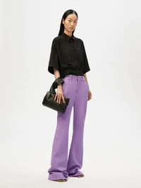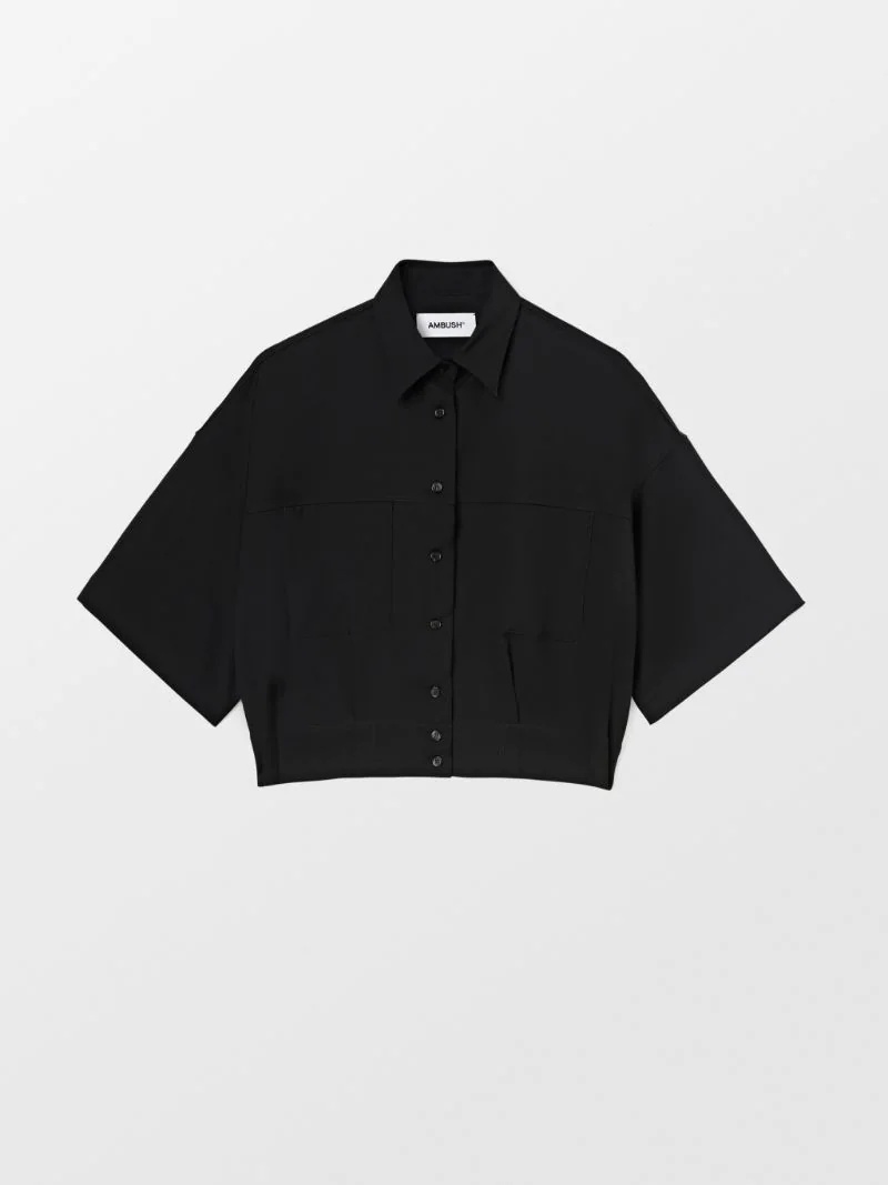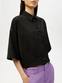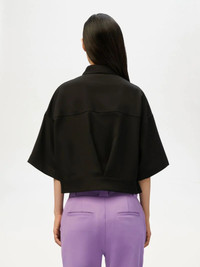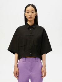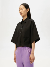 Cropped short sleeves wool shirt. Fitted waist. Product ID: BWGA030S22FAB0011000 SIZING MODEL TAN WEARS SIZE 40 HEIGHT: 5’ 9” (177 CM) BUST: 30” (77 CM) WAIST: 23” (59 CM) HIPS: 34” (87 CM) MATERIAL FABRIC: WOOL100%